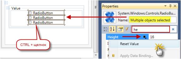 - В окне свойств сбросьте значения свойств Height («Высота») и Width («Ширина») для выбранных объектов RadioButton.