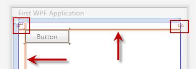 На поверхности разработки конструктора WPF отображаются декоративные элементы, предназначенные для перемещения и изменения размеров элементов управления с помощью мыши. Они также предоставляют визуальную информацию о выравнивании элемента управления и другие сведения об элементе.