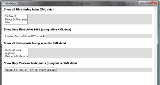 В двух верхних областях демонстрационного приложения используются данные XML, содержащиеся в коде XAML, а в двух нижних областях — внешний файл XML. XmlDataProvider с использованием данных, содержащихся в коде XAML (встроенных данных XML) Все данные XML могут находиться в файле XAML и использоваться как источник привязки. Рассмотрим эту ситуацию. <Window x:Class="BindingToXML.Window1" xmlns="https://schemas.microsoft.com/winfx/2006/xaml/presentation" xmlns:x="https://schemas.microsoft.com/winfx/2006/xaml" WindowStartupLocation="CenterScreen" Title="Window1" Height="800" Width="800"> <Window.Resources> <!-- встроенные данные XML --> <XmlDataProvider x:Key="xmlData" XPath="Films"> <x:XData> <Films > <Film Type="Horror" Year="1987"> <Director>Sam Raimi</Director> <Title>Evil Dead II</Title> </Film> <Film Type="Murder" Year="1991"> <Director>Jonathan Demme</Director> <Title>Silence Of The Lambs</Title> </Film> <Film Type="Sc" Year="1979"> <Director>Ridley Scott</Director> <Title>Alien</Title> </Film> </Films> </x:XData> </XmlDataProvider> </Window.Resources> <ScrollViewer> <StackPanel Orientation="Vertical"> <!--Простая привязка XPath с использованием встроенных данных XML --> <Label Content="Show all Films (using inline XML data)" Margin="5,0,0,0" FontSize="14" FontWeight="Bold" /> <StackPanel Orientation="Horizontal" Margin="10,10,10,10" Background="Gainsboro"> <ListBox ItemsSource="{Binding Source={StaticResource xmlData}, XPath=Film/Title}"/> </StackPanel> <!-- Более сложная привязка XPath с использованием встроенных данных XML --> <Label Content="Show Only Films After 1991 (using inline XML data)" Margin="5,0,0,0" FontSize="14" FontWeight="Bold" /> <StackPanel Orientation="Horizontal" Margin="10,10,10,10" Background="Gainsboro"> <ListBox ItemsSource="{Binding Source={StaticResource xmlData}, XPath=*[@Year>\=1991]}"/> </StackPanel> </StackPanel> </ScrollViewer> </Window> В этом примере поставщик XmlDataProviderиспользует встроенный (в код XAML) набор данных XML. И этот объект XmlDataProviderиспользуется как источник привязки для элемента ListBox. В первом элементе ListBox показаны все жанры и названия фильмов, поскольку выбирается весь набор узлов Film/Title с использованием выражения Binding.XPath=Film/Title, то есть отображаются все названия. Второй элемент ListBox более разборчив. В нем для обхода оси атрибутов используются запросы XPath и выбираются только те узлы, у которых Year > 1991, поэтому возвращается меньше узлов. XmlDataProvider с использованием внешнего файла XML Как я уже упоминал, с объектом XmlDataProvider чаще используются внешние файлы XML. Для этого свойству Source объекта XmlDataProviderприсваивается имя внешнего файла XML. <XmlDataProvider x:Key="xmlDataSeperateFile" XPath="Resteraunts" Source="XMLFile1.xml"> </XmlDataProvider> Это выражение, по сути, похоже на использованное выше, где запрос XPath применялся для выбора всех узлов или узлов, атрибуты которых отвечают заданным требованиям. В этом примере во втором элементе ListBoxпоказаны только мексиканские рестораны из файла XML. Для этого использовался следующий запрос XPath. <ListBox ItemsSource="{Binding Source={StaticResource xmlDataSeperateFile}, XPath=*[@Type\=\'Mexican\']}"/> Ниже приведен весь пример. <Window x:Class="BindingToXML.Window1" xmlns="https://schemas.microsoft.com/winfx/2006/xaml/presentation" xmlns:x="https://schemas.microsoft.com/winfx/2006/xaml" WindowStartupLocation="CenterScreen" Title="Window1" Height="800" Width="800"> <Window.Resources> <!-- внешние данные XML --> <XmlDataProvider x:Key="xmlDataSeperateFile" XPath="Resteraunts" Source="XMLFile1.xml"> </XmlDataProvider> </Window.Resources> <ScrollViewer> <StackPanel Orientation="Vertical"> <!-- Простая привязка XPath с использованием отдельных данных XML --> <Label Content="Show all Resteraunts (using seperate XML data)" Margin="5,0,0,0" FontSize="14" FontWeight="Bold" /> <StackPanel Orientation="Horizontal" Margin="10,10,10,10" Background="Gainsboro"> <ListBox ItemsSource="{Binding Source= {StaticResource xmlDataSeperateFile}, XPath=Resteraunt/Name}"/> </StackPanel> <!-- Более сложная привязка XPath с использованием отдельных данных XML --> <Label Content="Show Only Mexican Resteraunts (using inline XML data)" Margin="5,0,0,0" FontSize="14" FontWeight="Bold" /> <StackPanel Orientation="Horizontal" Margin="10,10,10,10" Background="Gainsboro"> <ListBox ItemsSource="{Binding Source={StaticResource xmlDataSeperateFile}, XPath=*[@Type\=\'Mexican\']}"/> </StackPanel> </StackPanel> </ScrollViewer> </Window> А здесь соответствующий файл XML (на случай, если вы заинтересуетесь его структурой). <?xml version="1.0" encoding="utf-8" ?> <Resteraunts > <Resteraunt Type=