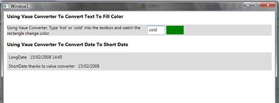 В этом небольшом примере используются два преобразователя значений. Первый преобразует название цвета в объект Brush, который используется для раскраски объекта Rectangle. Второй использует объект DataContext, заданный явно в коде программной части, а свойству DataContext двух объектов Label присваивается новый объект DataContext. Посмотрим код. Сначала XAML. <Window x:Class="ValueConverters.Window1" xmlns="https://schemas.microsoft.com/winfx/2006/xaml/presentation" xmlns:x="https://schemas.microsoft.com/winfx/2006/xaml" xmlns:local="clr-namespace:ValueConverters" WindowStartupLocation="CenterScreen" Title="Window1" Height="800" Width="800"> <Window.Resources> <local:WordToColorConverter x:Key="wordToColorConv"/> <local:DateConverter x:Key="dateConv"/> </Window.Resources> <ScrollViewer HorizontalScrollBarVisibility="Auto" VerticalScrollBarVisibility="Auto"> <StackPanel Orientation="Vertical"> <!--Использование преобразователя значения для преобразования текста в цвет --> <Label Content="Using Vaue Converter To Convert Text To Fill Color" Margin="5,0,0,0" FontSize="14" FontWeight="Bold" /> <StackPanel Orientation="Horizontal" Margin="10,10,10,10" Background="Gainsboro"> <TextBlock TextWrapping="Wrap" Text="Using Vaue Converter. Type 'hot' or 'cold' into the textbox and watch the rectangle change color" Width="400"/> <TextBox x:Name="txtSource" Width="50" Height="25" Margin="5,0,0,0"/> <Rectangle Width="50" Height="25" Margin="5,0,0,0" Fill="{Binding ElementName=txtSource, Path=Text, Converter={StaticResource wordToColorConv}}" /> </StackPanel> <!-- Использование преобразователя значения для преобразования даты в короткий формат --> <Label Content="Using Vaue Converter To Convert Date To Short Date" Margin="5,0,0,0" FontSize="14" FontWeight="Bold" /> <StackPanel Orientation="Vertical" Margin="10,10,10,10" Background="Gainsboro"> <StackPanel Orientation="Horizontal"> <Label Content="LongDate"/> <Label x:Name="lblLongDate" Content="{Binding Path=Now}"/> </StackPanel> <StackPanel Orientation="Horizontal"> <Label Content="ShortDate thanks to value converter"/> <Label x:Name="lblShortDate" Content="{Binding Path=Now, Converter={StaticResource dateConv}}"/> </StackPanel> </StackPanel> </StackPanel> </ScrollViewer> </Window> А здесь код программной части для этого окна. using System; using System.Collections.Generic; using System.Linq; using System.Text; using System.Windows; using System.Windows.Controls; using System.Windows.Data; using System.Windows.Documents; using System.Windows.Input; using System.Windows.Media; using System.Windows.Media.Imaging; using System.Windows.Navigation; using System.Windows.Shapes; namespace ValueConverters { /// <summary> /// Логика взаимодействия для Window1.xaml /// </summary> public partial class Window1 : Window { public Window1() { InitializeComponent(); lblLongDate.DataContext = new DateTime(); lblShortDate.DataContext = new DateTime(); } } } И, наконец, преобразователи. using System; using System.Collections.Generic; using System.Linq; using System.Text; using System.Windows.Data; using System.Windows.Media; using System.Globalization; namespace ValueConverters { [ValueConversion(typeof(String), typeof(SolidColorBrush))] public class WordToColorConverter : IValueConverter { public object Convert(object value, Type targetType, object parameter, CultureInfo culture) { string boundWord = value as string; SolidColorBrush returnBrush = null; switch (boundWord.ToLower().Trim()) { case "hot": returnBrush = new SolidColorBrush(Colors.Red); break; case "cold": returnBrush = new SolidColorBrush(Colors.Green); break; default: returnBrush = new SolidColorBrush(Colors.Yellow); break; } return returnBrush; } public object ConvertBack(object value, Type targetType, object parameter, CultureInfo culture) { throw new Exception("Cant convert back"); } } } using System; using System.Collections.Generic; using System.Linq; using System.Text; using System.Windows.Data; using System.Windows.Media; using System.Globalization; namespace ValueConverters { [ValueConversion(typeof(DateTime), typeof(String))] public class DateConverter : IValueConverter { public object Convert(object value, Type targetType, object parameter, CultureInfo culture) { DateTime date = (DateTime)value; return date.ToShortDateString(); } public object ConvertBack(object value, Type targetType, object parameter, CultureInfo culture) { string strValue = value.ToString(); DateTime resultDateTime; if (DateTime.TryParse(strValue, out resultDateTime)) { return resultDateTime; } return value; } } } А здесь приводится версия VB.NET для кода программной части. Imports System Imports System.Collections.Generic Imports System.Linq Imports System.Text Imports System.Windows Imports System.Windows.Controls Imports System.Windows.Data Imports System.Windows.Documents Imports System.Windows.Input Imports System.Windows.Media Imports System.Windows.Media.Imaging Imports System.Windows.Navigation Imports System.Windows.Shapes ''' <summary> ''' Логика взаимодействия для Window1.xaml ''' </summary> Partial Public Class Window1 Inherits Window Public Sub New() InitializeComponent() lblLongDate.DataContext = New DateTime() lblShortDate.DataContext = New DateTime() End Sub End Class Преобразователи на VB.NET. Imports System Imports System.Collections.Generic Imports System.Linq Imports System.Text Imports System.Windows.Data Imports System.Windows.Media Imports System.Globalization