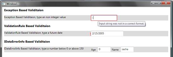 Изменение внешнего вида при проверке В проект Validation я включил несколько стилей. Этой области мы еще не касались. Но другого выхода у нас нет. На данный момент вам всего лишь нужно знать, что недопустимый ввод в элементе TextBox приведет к изменению внешнего вида соответствующего элемента за счет стиля или шаблона. И еще один момент. Всплывающая подсказка TextBox.ToolTip отображает сообщение проверки правильности. Это также реализуется с помощью более «умной» привязки. <Setter Property="ToolTip" Value="{Binding RelativeSource={RelativeSource Self}, Path=(Validation.Errors)[0].ErrorContent}"/> Как я уже сказал, я не хочу увязнуть в обсуждении стилей и шаблонов, так как это тема следующей статьи, и все же этот элемент заслуживает упоминания. Проверка на основе исключений Возможно, самый простой способ проверки привязки — применить правило проверки на основе исключений. Любое исключение, возникшее при попытке обновления привязанного свойства, можно использовать для информирования пользователя. Как правило, в этом случае отображается сообщение подсказки и изменяется внешний вид элемента TextBox. Воспользуемся простым тестовым классом для привязки. using System; using System.Collections.Generic; using System.Linq; using System.Text; namespace Validation { public class TestClass { public int Age { get; set; } public DateTime StartDate { get; set; } public TestClass() { StartDate = DateTime.Now; } } } А здесь приводится версия VB.NET. Imports System Imports System.Collections.Generic Imports System.Linq Imports System.Text Public Class TestClass Private m_Age As Integer = 1 Private m_StartDate As DateTime Public Property Age() As Integer Get Return m_Age End Get Set(ByVal value As Integer) m_Age = value End Set End Property Public Property StartDate() As DateTime Get Return m_StartDate End Get Set(ByVal value As DateTime) m_StartDate = value End Set End Property Public Sub New() m_StartDate = DateTime.Now End Sub End Class Зададим привязку в коде программной части следующим образом (с помощью свойства DataContext). using System; using System.Collections.Generic; using System.Linq; using System.Text; using System.Windows; using System.Windows.Controls; using System.Windows.Data; using System.Windows.Documents; using System.Windows.Input; using System.Windows.Media; using System.Windows.Media.Imaging; using System.Windows.Navigation; using System.Windows.Shapes; namespace Validation { /// <summary> /// Логика взаимодействия для Window1.xaml /// </summary> public partial class Window1 : Window { public Window1() { InitializeComponent(); this.DataContext = new TestClass(); txtIDataErrorInfoAge.DataContext = new Person(); txtIDataErrorInfoName.DataContext = new Person(); } } } И на VB.NET. Imports System Imports System.Collections.Generic Imports System.Linq Imports System.Text Imports System.Windows Imports System.Windows.Controls Imports System.Windows.Data Imports System.Windows.Documents Imports System.Windows.Input Imports System.Windows.Media Imports System.Windows.Media.Imaging Imports System.Windows.Navigation Imports System.Windows.Shapes ''' <summary> ''' Логика взаимодействия для Window1.xaml ''' </summary> Partial Public Class Window1 Inherits Window Public Sub New() InitializeComponent() Me.DataContext = New TestClass txtIDataErrorInfoAge.DataContext = New Person txtIDataErrorInfoName.DataContext = New Person End Sub End Class Затем можно использовать проверку на основе исключений в XAML. <Window x:Class="Validation.Window1" xmlns="https://schemas.microsoft.com/winfx/2006/xaml/presentation" xmlns:x="https://schemas.microsoft.com/winfx/2006/xaml" xmlns:local="clr-namespace:Validation" Title="Window1" Height="800" Width="800" WindowStartupLocation="CenterScreen"> <Window.Resources> <!--Стиль TextBox проверки на основе исключений и правила проверки --> <Style x:Key="textStyleTextBox" TargetType="TextBox"> <Setter Property="Foreground" Value="#333333" /> <Style.Triggers> <Trigger Property="Validation.HasError" Value="true"> <Setter Property="ToolTip" Value="{Binding RelativeSource={RelativeSource Self}, Path=(Validation.Errors)[0].ErrorContent}"/> </Trigger> </Style.Triggers> </Style> <!--Шаблон элемента управления для проверки на основе правила проверки --> <ControlTemplate x:Key="validationTemplate"> <DockPanel> <TextBlock Foreground="Red" FontSize="20">!</TextBlock> <AdornedElementPlaceholder/> </DockPanel> </ControlTemplate> </Window.Resources> <ScrollViewer HorizontalScrollBarVisibility="Auto" VerticalScrollBarVisibility="Auto"> <StackPanel Orientation="Vertical"> <!-- Проверка на основе исключений --> <Label Content="Exception Based Validitaion" Margin="5,0,0,0" FontSize="14" FontWeight="Bold" /> <StackPanel Orientation="Horizontal" Margin="10,10,10,10" Background="Gainsboro"> <TextBlock TextWrapping="Wrap" Text="Exception Based Validitaion, type 