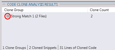 - По завершении анализа в окне Code Clone Analysis Results (Обнаруженные клоны в исходном коде) отображаются сходные блоки кода, сгруппированные по степени совпадения. Нажмите кнопку «+» слева от группы Strong Match (Близкое совпадение), чтобы открыть два файла, в которых присутствуют практически аналогичные блоки.