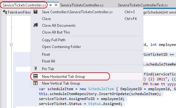 - Дважды щелкните каждое совпадение, чтобы открыть их в редакторе кода, затем щелкните правой кнопкой заголовок одной из вкладок и выберите пункт New Horizontal Tab Group (Новая горизонтальная группа вкладок) в контекстном меню.