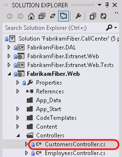 - Вы также можете сузить область поиска клонов исходного кода, если это необходимо. В окне Solution Explorer (Обозреватель решений) перейдите в папку Controllers (Контроллеры) проекта FabrikamFiber.Web (Веб-страница FabrikamFiber) и откройте файл CustomersController.cs в редакторе кода.