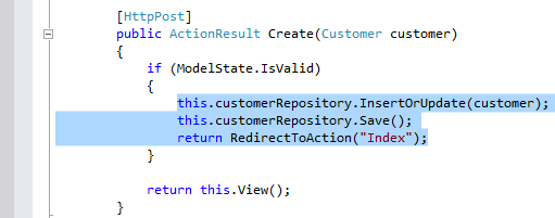 - Прокрутите страницу вниз и найдите метод Create (Создать), который использует параметр Customer (Клиент). Выделите три строки, начиная с оператора if (если).