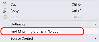 - Щелкните правой кнопкой выбранный блок кода и выберите пункт Find Matching Clones in Solution (Найти близкие совпадения в решении) в контекстном меню.