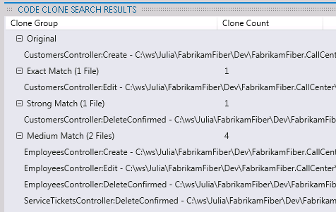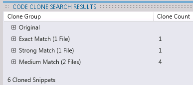 - Разверните все группы клонов и просмотрите обнаруженные совпадения, в том числе в исходной группе клонов. Если увеличить размер окна Code Clone Search Results (Обнаруженные клоны кода), вы сможете увидеть сразу все совпадения.