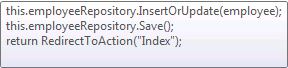 - Пролистайте код и найдите метод AssignSchedule (Назначить расписание) в обоих файлах. Обратите внимание, что блоки кода практически полностью совпадают, за исключением последней строки, в которой вызывается метод RedirectToAction (Перенаправление к действию). Это означает, что данный метод является подходящим для рефакторинга. Такой всеобъемлющий поиск особенно полезен в процессе обнаружения кода, который подходит для рефакторинга с целью упрощения обслуживания в будущем.