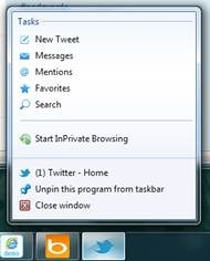 Для задач и категорий вы задаете текст, ссылку и иконку. Добавление задач в JumpList Задачами в JumpList могут быть ссылки на основные разделы вашего ресурса или важные для пользователя функции вашего приложения, например, это могут быть ссылки на профайл пользователя или его личный ящик сообщений. Это может быть ссылка на поиск по сайту или свежие новости. Всего вы можете добавить до 5-ти задач. Нажатие на каждую из задач будет приводить к открытию новой вкладки с соответствующей ссылкой. Для добавления задач нужно использовать meta-тег следующего формата: <meta name="msapplication-task" content="name=Task 1;action-uri=http://host/Page1.html; icon-uri=http://host/icon1.ico" /> <meta name="msapplication-task" content="name=Task 2;action-uri=https://microsoft.com/Page2.html; icon-uri=http://host/icon2.ico" /> Ссылки не обязаны быть в одном домене. Задачи добавляются в меню в том же порядке, в котором они указаны на странице. Для каждой задачи вы можете определить свою собственную иконку. Вот так, например, выглядит задание задач на странице Twitter: <meta name="msapplication-task" content="name=New Tweet; action-uri=http://twitter.com/home; icon-uri=images/ie/tweet.ico" /> <meta name="msapplication-task" content="name=Messages; action-uri=http://twitter.com/inbox; icon-uri=images/ie/dm.ico" /> <meta name="msapplication-task" content="name=Mentions; action-uri=http://twitter.com/replies; icon-uri=images/ie/mentions.ico" /> <meta name="msapplication-task" content="name=Favorites; action-uri=http://twitter.com/favorites; icon-uri=images/ie/fav.ico" /> <meta name="msapplication-task" content="name=Search; action-uri=http://search.twitter.com; icon-uri=images/ie/search.ico" />