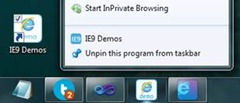 Обратите внимание, что вы можете задавать любые ссылки и, в частности, можете добавлять в них параметры GET-запроса, которые, например, можно отслеживать на сервере сбора статистики и аналитики посещений. Многие сервисы анализа посещаемости, например, Google Analytics позволяют отслеживать ссылки со специальными параметрами. Так вы сможете узнать, сколько пользователей приходят к вам, используя именно закрепленную версию сайта. Только не забудьте рассказать пользователям, что они могут закрепить ваш сайт и получить дополнительные возможности и удобства работы ;) Определение поддержки функциональности и состояния браузера Прежде, чем двигаться дальше в сторону динамичных настроек нужно разобраться с одной важной задачей: перед тем, как вызывать какие-то специфичные API из JavaScript, нужно убедиться, что браузер их поддерживает, а браузер с сайтом находится именно в закрепленном состоянии. Чтобы определить, что браузер поддерживает нужный режим, и сайт запущен в закрепленном режиме, следует воспользоваться функцией msIsSiteMode. Для этого можно использовать примерно такое код: if (window.external.msIsSiteMode) { // Check if the website was launched from a pinned site. if (window.external.msIsSiteMode()) { // Site is running in pinned mode } else { // Site is not running in pinned mode } } else { // Browser does not support pinned site mode } Однако есть важный нюанс: в IE9 beta есть известный баг с определением наличия нужного свойства, поэтому код выше правильный, но работать не будет. Сам баг, думаю, скоро будет исправлен. В качестве альтернативы можно использовать код, работающий через исключения: try { if (window.external.msIsSiteMode()) { // Site is running in pinned mode } else { // Site is not running in pinned mode } } catch (e) { // Browser does not support pinned site mode } Либо вот такой немножко более хитрый вариант в виде функции: checkPinnedSiteMode = function () { // return window.external.msIsSiteMode && window.external.msIsSiteMode()); // workaround for beta return window.external && "msIsSiteMode" in window.external && window.external.msIsSiteMode(); }; или с присваиванием нужного значения переменной: var isPinnedSiteMode = window.external && "msIsSiteMode" in window.external && window.external.msIsSiteMode(); Дальше остается только убедиться, что нужный режим поддерживается и браузер с сайтом находится в нужном состоянии — и вызывать тот или иной код. Добавление категорий в JumpList Собственно, категорию можно добавить только одну J Категория, в отличие от задач сайта, предполагает отображение потока некоторых характерных объектов. Если у вас новостной сайт, это может быть поток новостей или поток самых важных новостей (аля «новость часа», или «новости с главной»). Если ваше веб-приложение предоставляет пользователю функционал по работе с какими-то документами (в общем смысле), это может быть поток последних документов, с которыми пользователь работал. Если ваш веб-сайт представляет собой социальную сеть, это может быть поток друзей пользователя, которые зашли в сеть. Пользователь, соответственно, прямо из контекстного меню иконки приложения получает прямой доступ к этим объектам. Учтите, что пользователь может самостоятельно закреплять те ссылки, которые для него предоставляют особый интерес. Например, документы с которыми, он работает чаще всего, или новости, которые он хочет прочитать позже. Также он может самостоятельно удалять элементы из этого списка! Когда пользователь нажимает на любую из ссылок, открывается новое окно с соответствующим адресом. И да, напомню, эти ссылки остаются напрямую доступными из меню даже, когда приложение с сайтом закрыто.