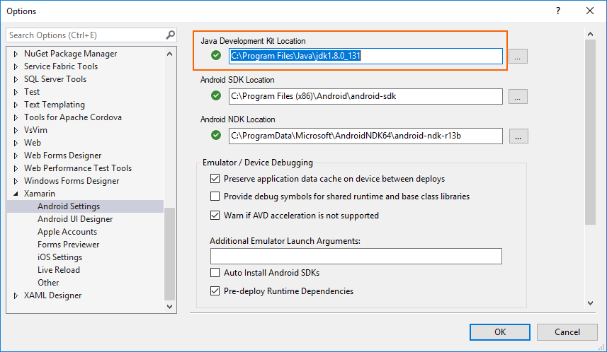 Откройте Visual Studio и обновите расположение пакета средств java для разработки, чтобы указать новый JDK в разделе "Параметры > инструментов>" Xamarin > Android Параметры > Расположение пакета средств разработки Java:
