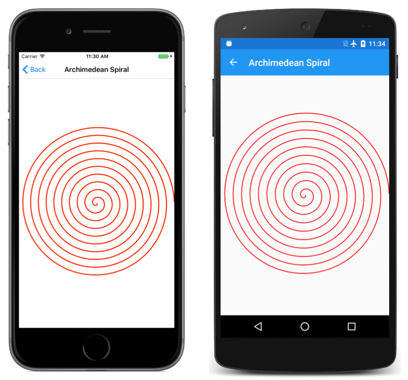 В разделе "Кривые и пути SkiaSharp" этого руководства вы увидите различные методы, определяющие SKPath для отображения определенных типов кривых. Однако иногда необходимо нарисовать тип кривой, который не поддерживается SKPathнапрямую. В таком случае можно использовать полилайн (коллекцию подключенных линий) для рисования любой кривой, которую можно математически определить. Если вы делаете линии достаточно маленькими и достаточно многочисленными, результат будет выглядеть как кривая. Эта спираль на самом деле составляет 3600 маленьких линий: