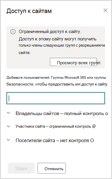 Общий доступ к сайтам SharePoint и их содержимому не соответствует политике ограниченного доступа к сайту по умолчанию. Администратор SharePoint может ограничить общий доступ к сайту и его содержимому пользователям, которые не являются членами группы с ограниченным контроль доступа.