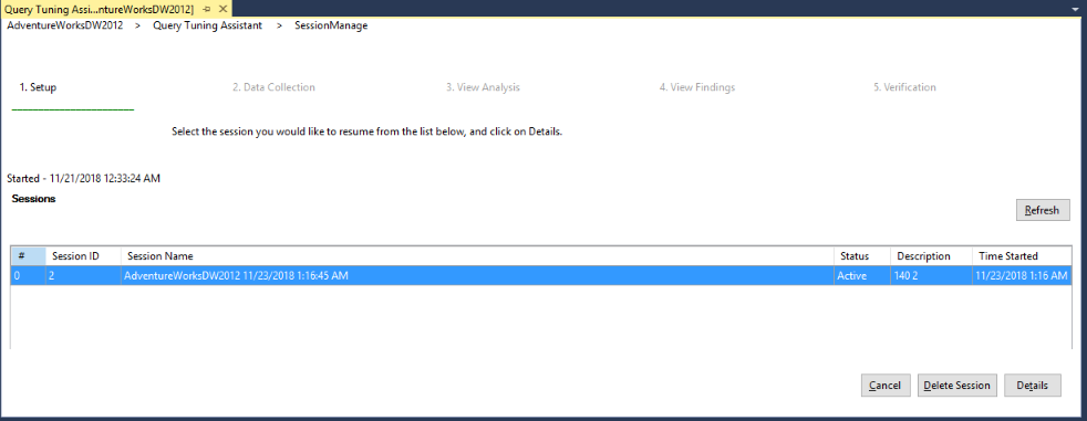 Кнопка Удалить сеанс служит для удаления всех данных, сохраненных для выбранного сеанса. Однако при удалении закрытого сеанса не удаляются ранее развернутые план-гайды. Если вы удалите сеанс, в котором были развернуты плановые руководства, вы не сможете использовать QTA для отмены изменений. Вместо этого найдите помощники плана с помощью системной таблицы sys.plan_guides и удалите их вручную, используя sp_control_plan_guide.