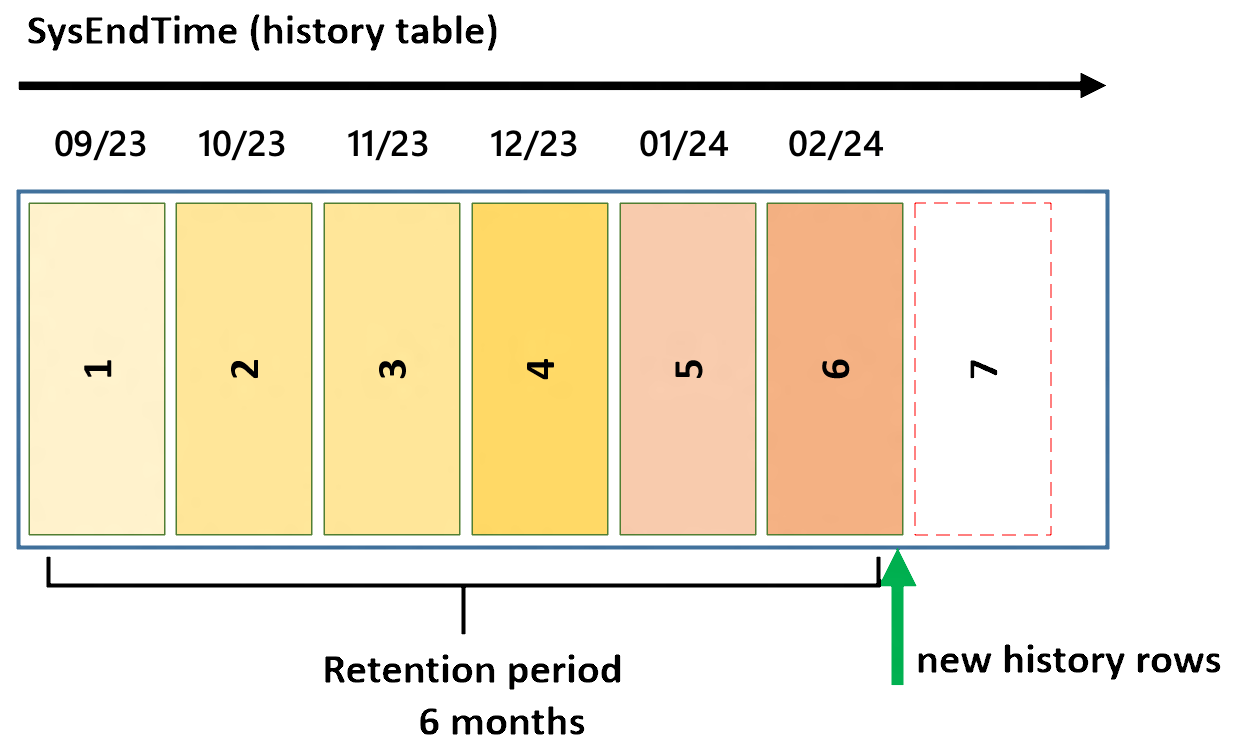 На рисунке предположим, что вы хотите хранить исторические данные в течение шести месяцев и хранить каждый месяц данных в отдельной секции. Кроме того, предположим, что вы активировали системное управление версиями в сентябре 2023 года.