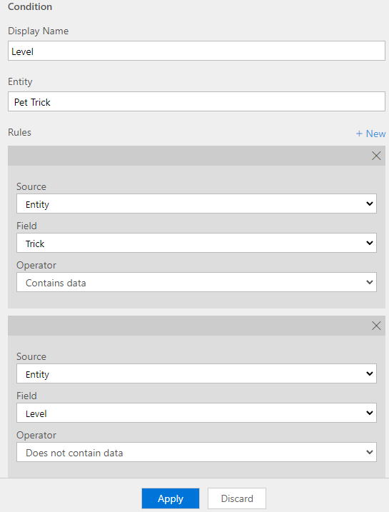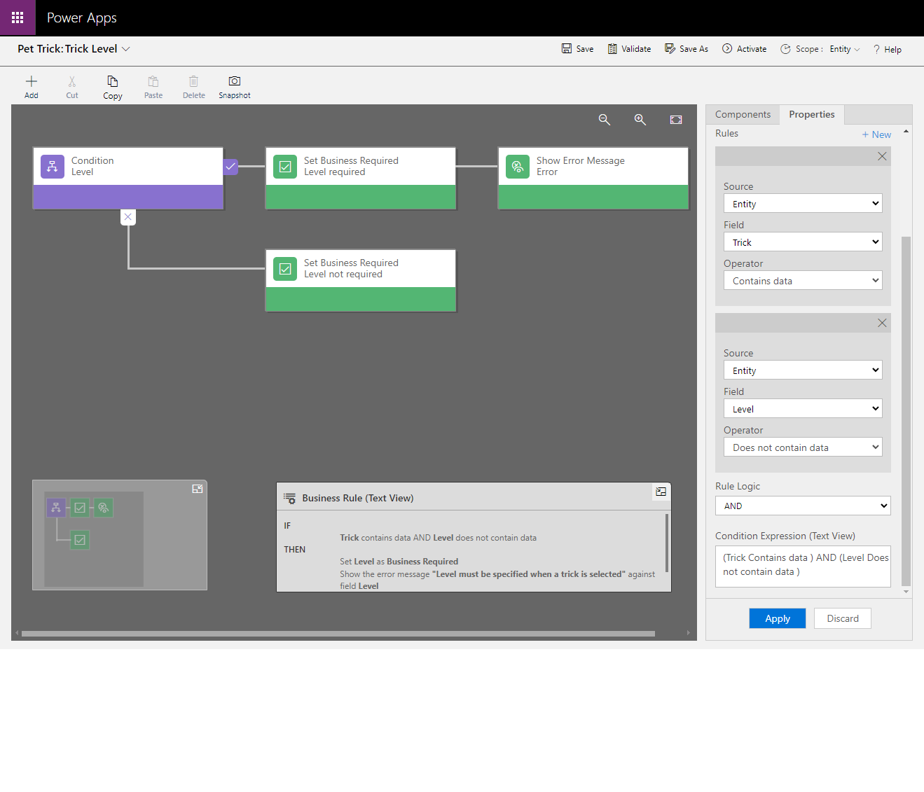 All business rules start with a condition. Conditions are shown in purple in the business rule editor. The first condition is a trigger and is used to determine if the business rule is run based on the values in the table's columns. A condition is always evaluated as either true or false. The true path is to the right of the condition, and the false path is beneath the condition. A condition is a simple if..then..else expression.