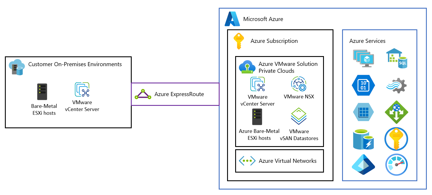 Развертывание оборудования и программного обеспечения частного облака решения Azure VMware полностью интегрировано и автоматизировано в Azure. На приведенной ниже схеме показана связь между локальным окружением VMware, решением Azure VMware и всеми службами Azure, к которым может подключаться решение Azure VMware.