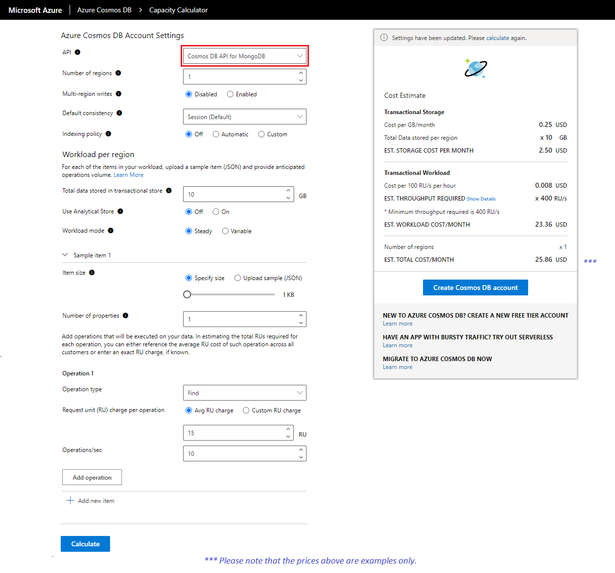 Оценка емкости с помощью калькулятора емкости Azure Cosmos DB