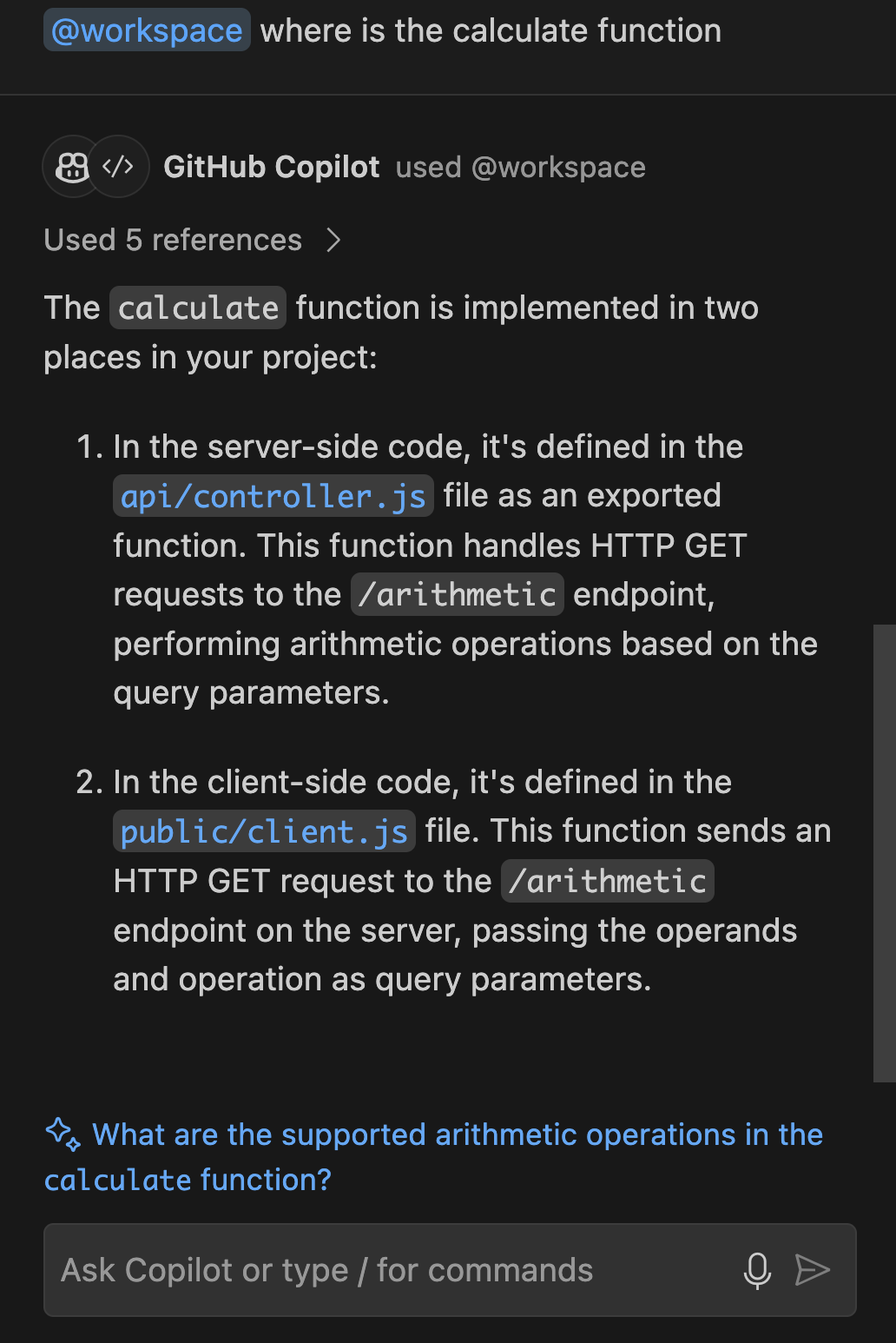 @workspace. Эта функция позволяет Copilot Chat рассмотреть более широкий контекст проектов и конфигураций, которые в настоящее время открыты в интегрированной среде разработки Visual Studio. Например, запрос "@workspace где находится функция вычисления?" побуждает Copilot рассмотреть весь проект, чтобы найти наиболее релевантную информацию.
