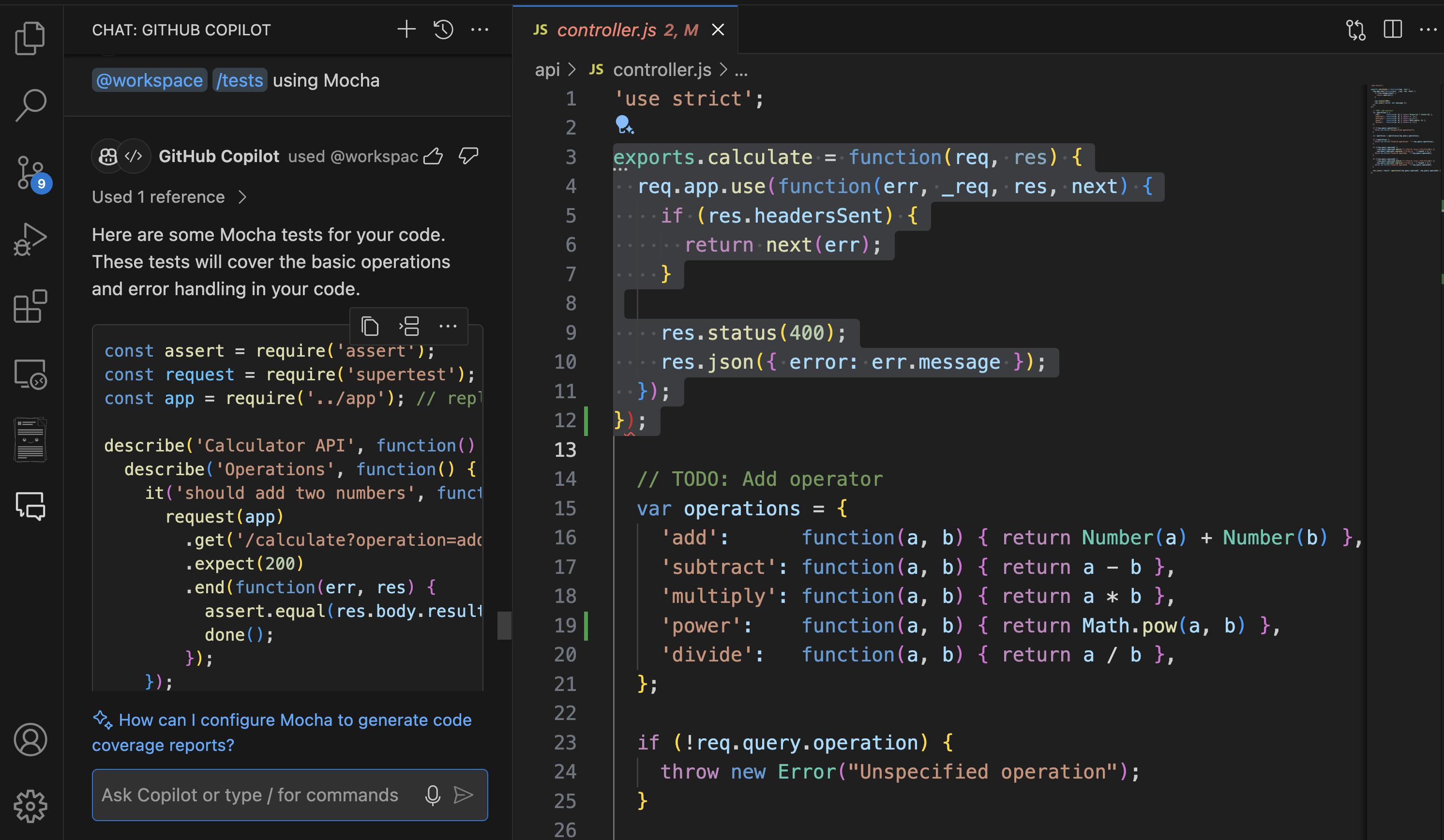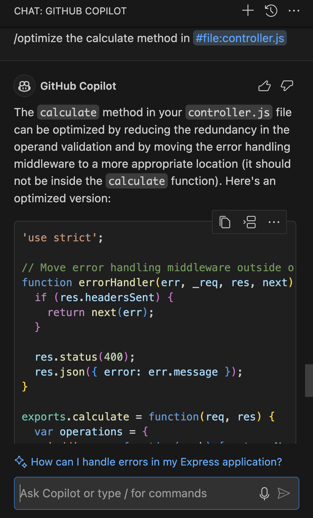 /optimize theвычислениеmethod in controller.jsсосредоточено на повышении производительности этого конкретного метода./test: автоматически создает модульные тесты для выбранного кода. Вы можете просто выделить код и использовать