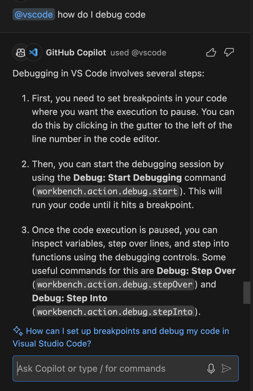 - Отладка с помощью чата GitHub Copilot.