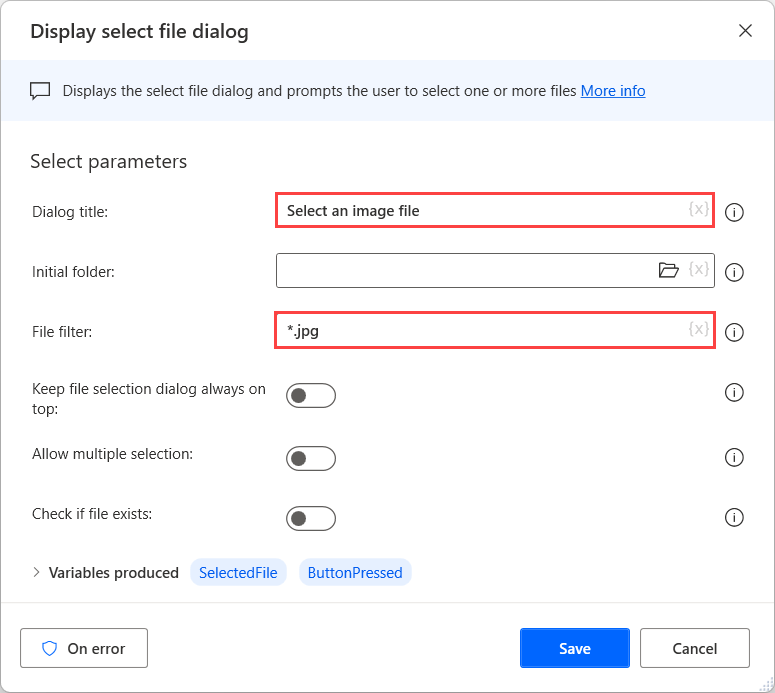 Use the Display select file dialog action to prompt users to select an image file. In the File filter field, enter the value *.jpg to limit the selectable files.