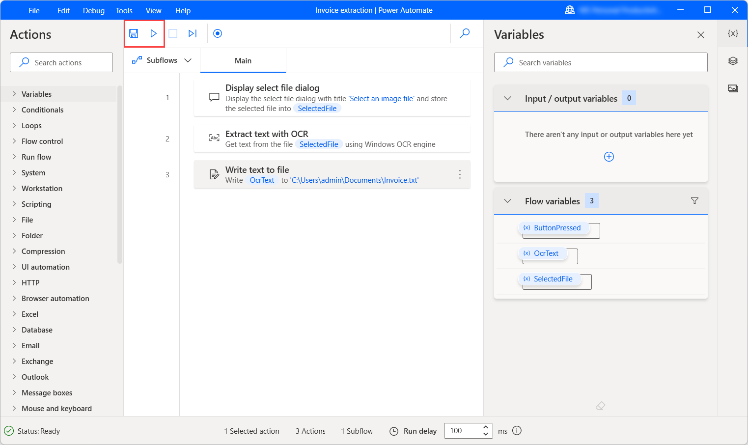 In this exercise, you create a flow that extracts invoice data from scanned documents and saves it to a text file.