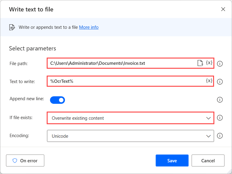 Use a Write text to file action to write the extracted text to a .txt file. For this example, we chose to overwrite the existing content of the file in each execution.