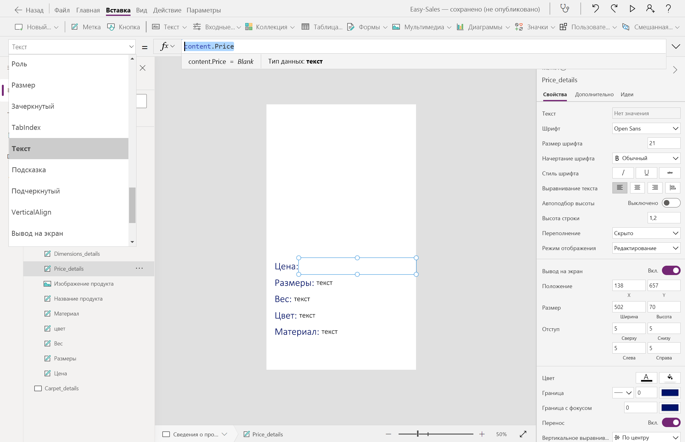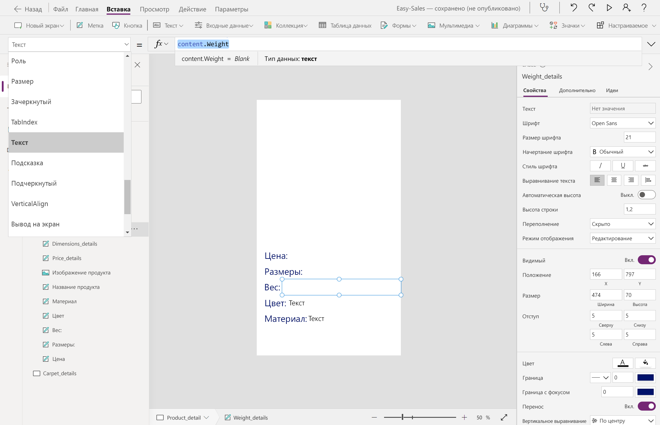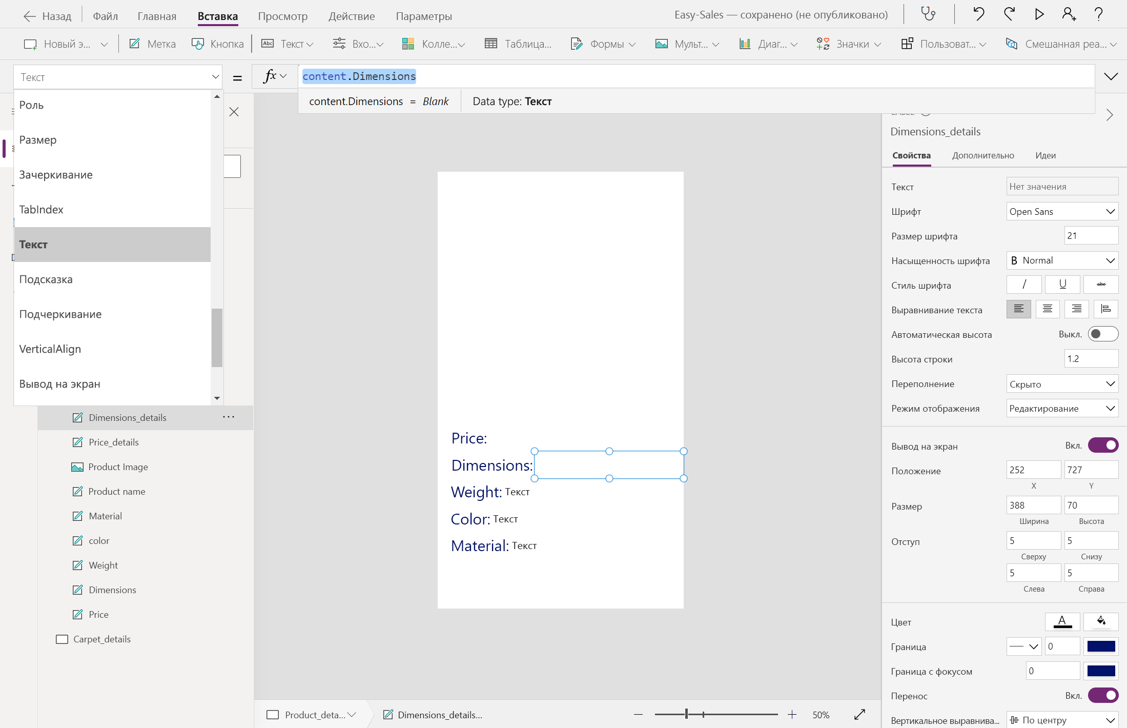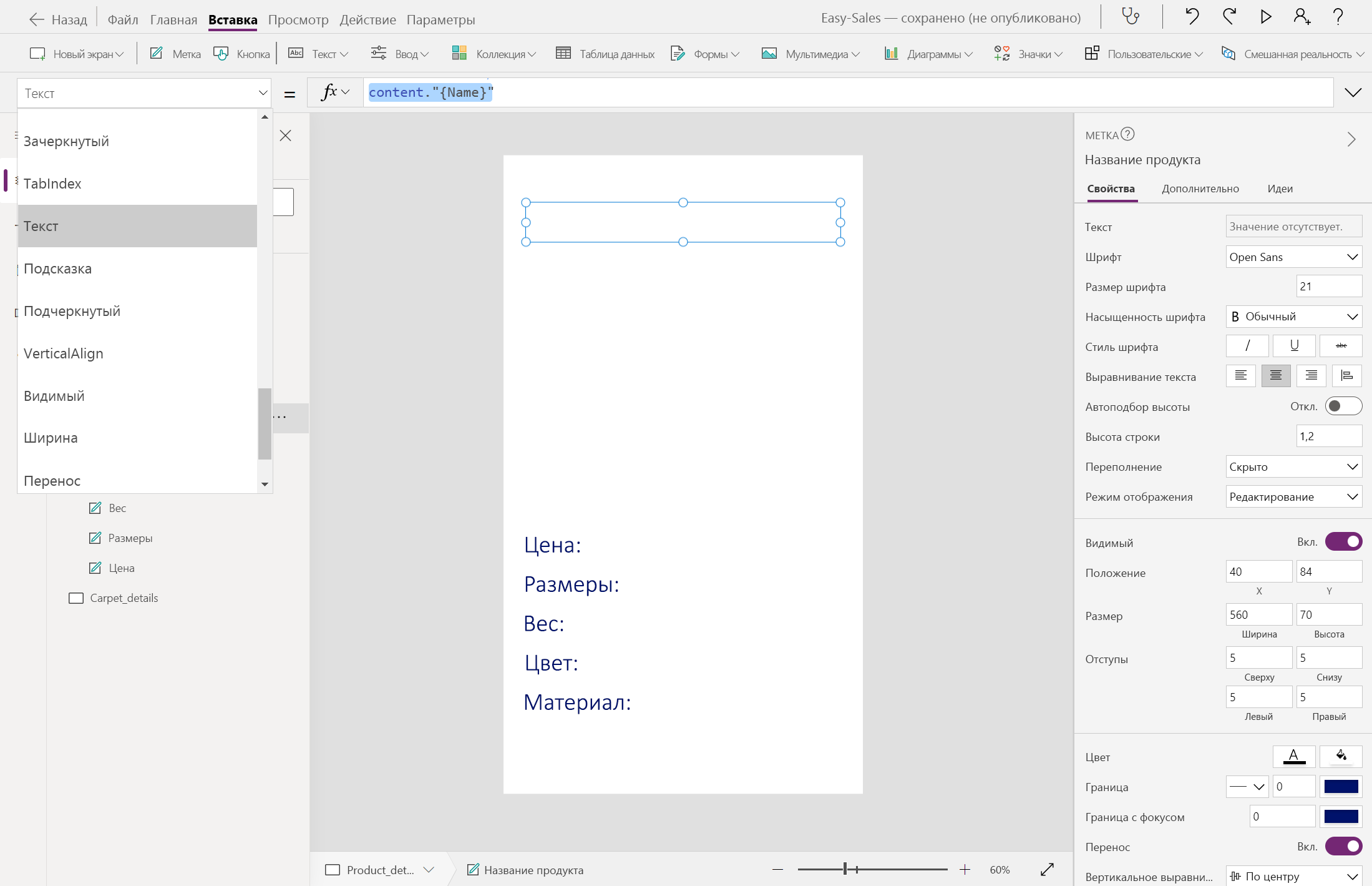 Navigate(Product_details,ScreenTransition.Cover,{content : ThisItem})Navigate(Carpet_details,ScreenTransition.Cover,{content_carpets : ThisItem})Давайте начнем создавать страницу Product_details , добавив несколько меток, таких как цена, измерения, вес, цвет и материал. Текст можно изменить внутри метки, вставив нужный текст в свойство Text этой метки. Переименуйте метки соответствующим образом.
