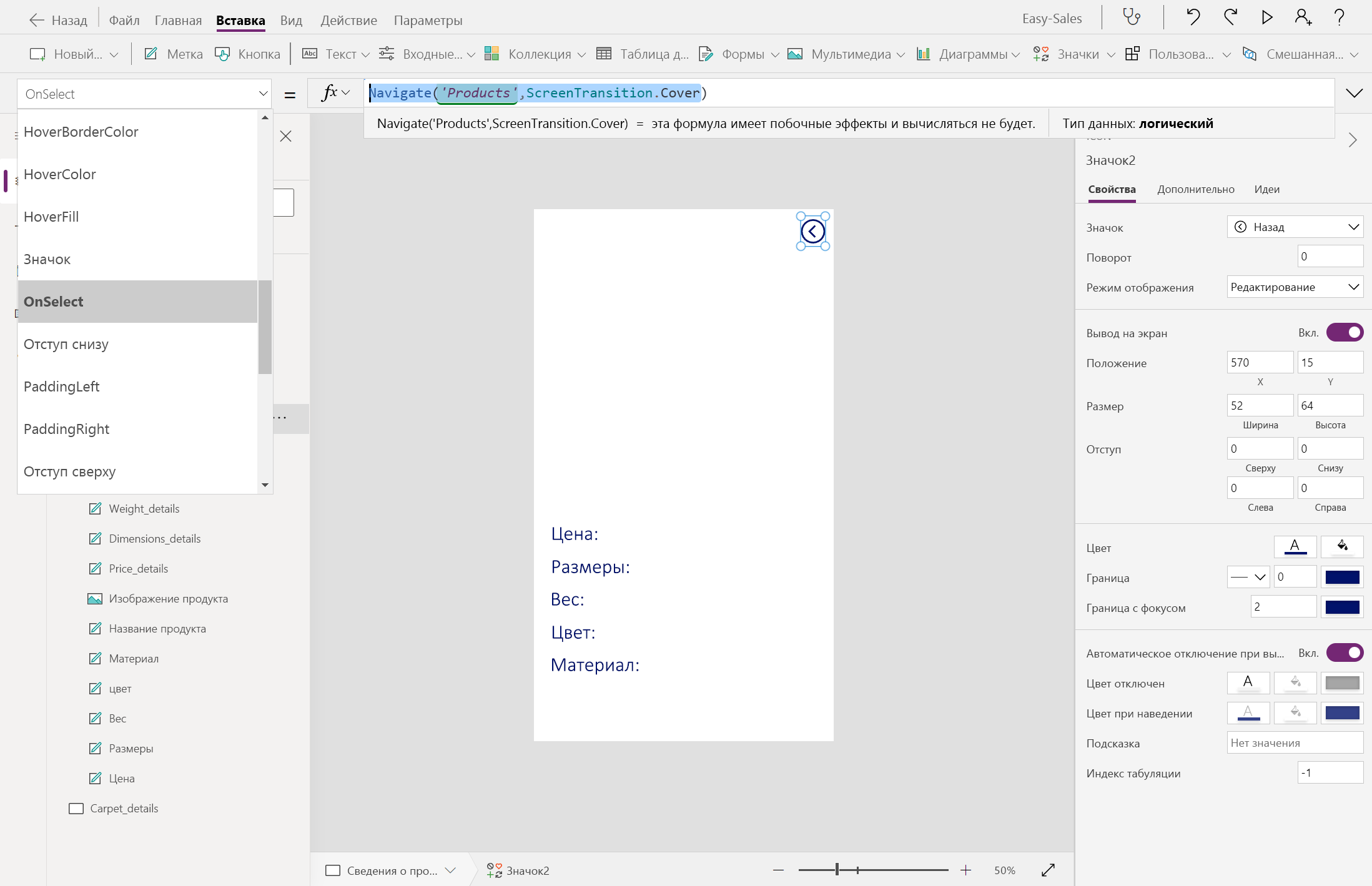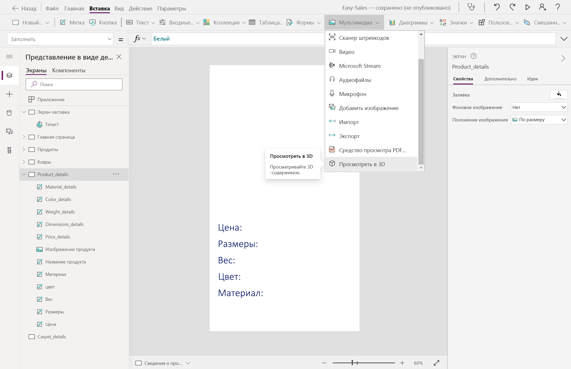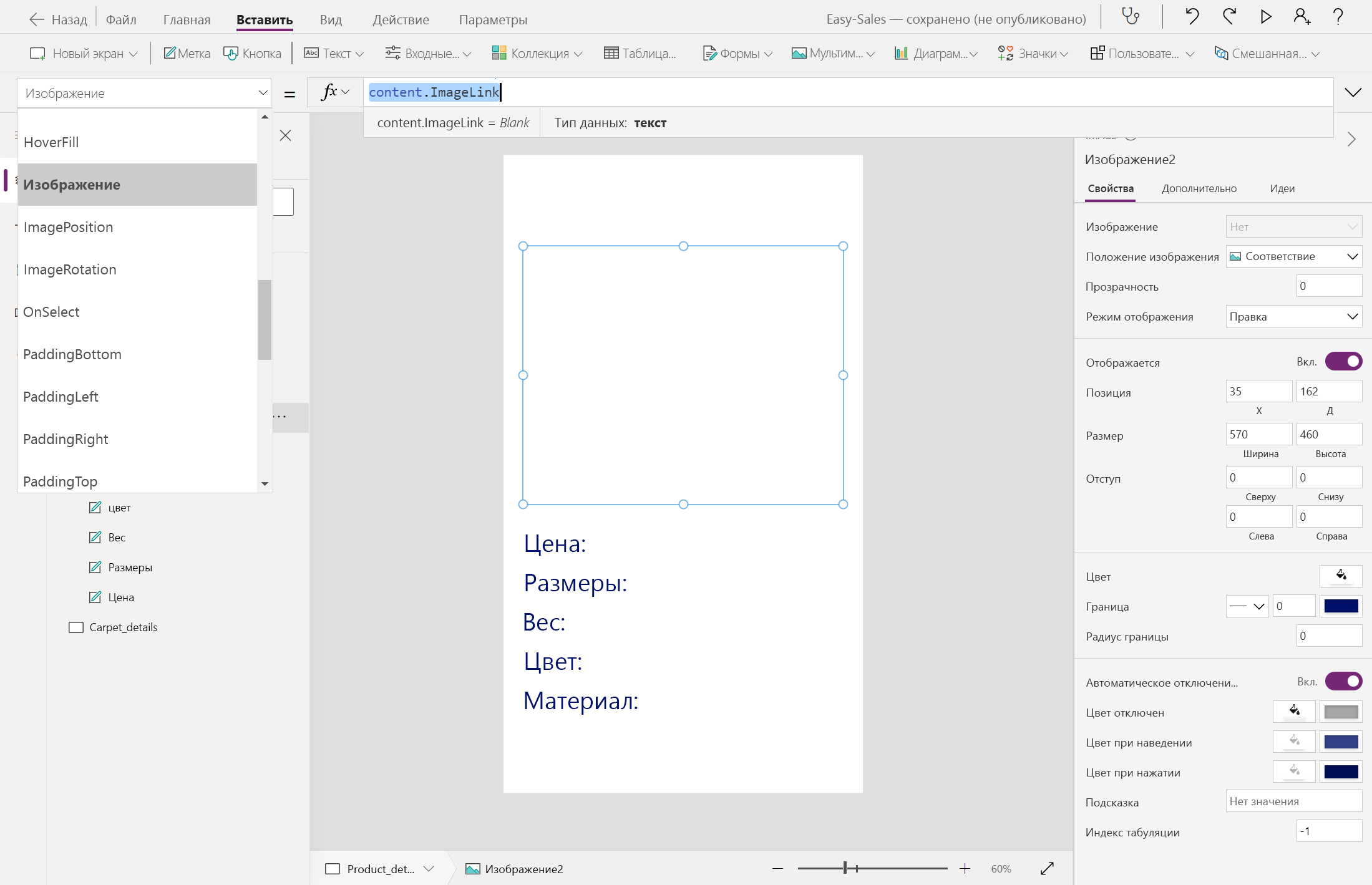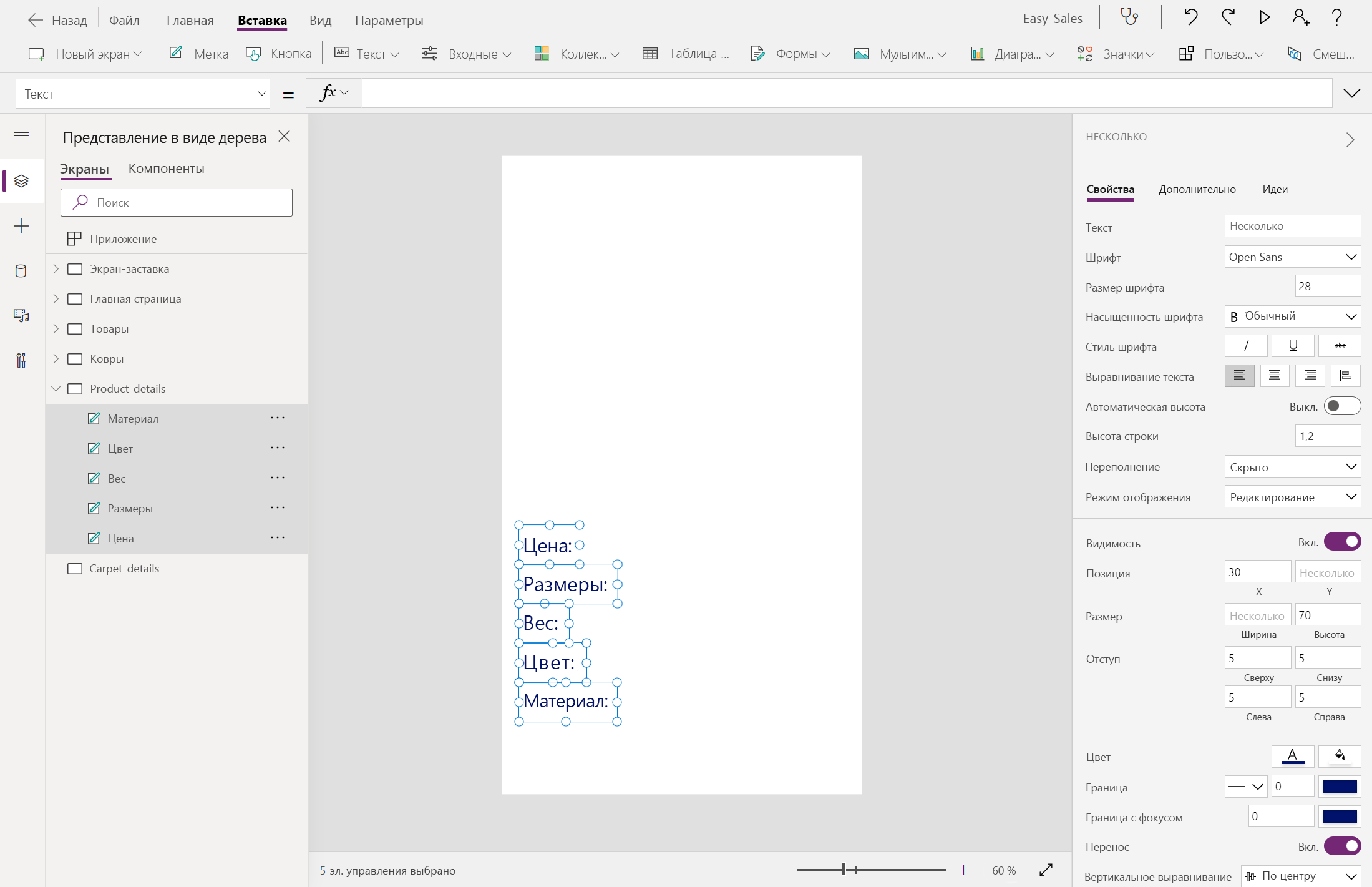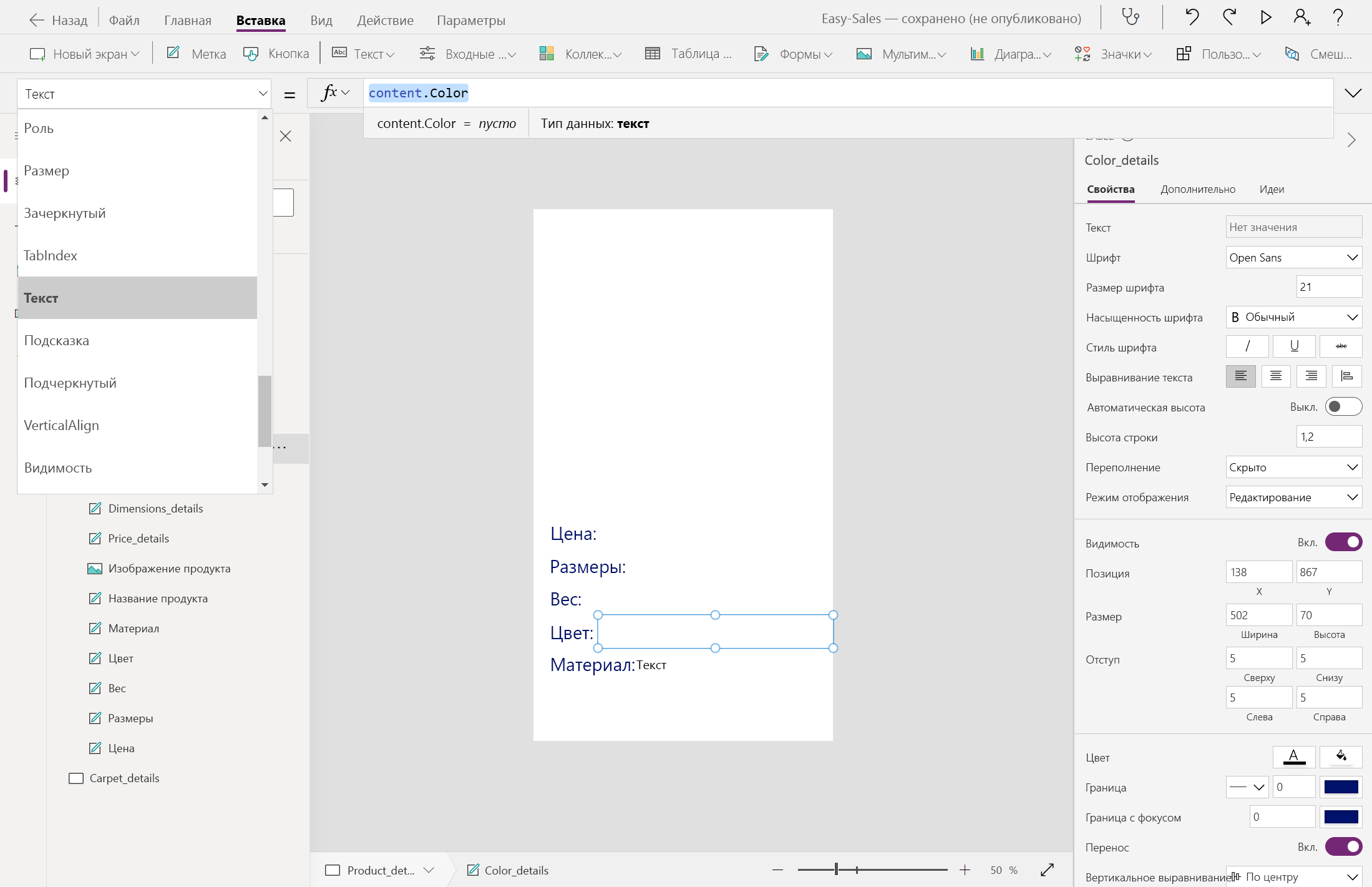 Navigate(Product_details,ScreenTransition.Cover,{content : ThisItem})Navigate(Carpet_details,ScreenTransition.Cover,{content_carpets : ThisItem})Давайте начнем создавать страницу Product_details , добавив несколько меток, таких как цена, измерения, вес, цвет и материал. Текст можно изменить внутри метки, вставив нужный текст в свойство Text этой метки. Переименуйте метки соответствующим образом.
