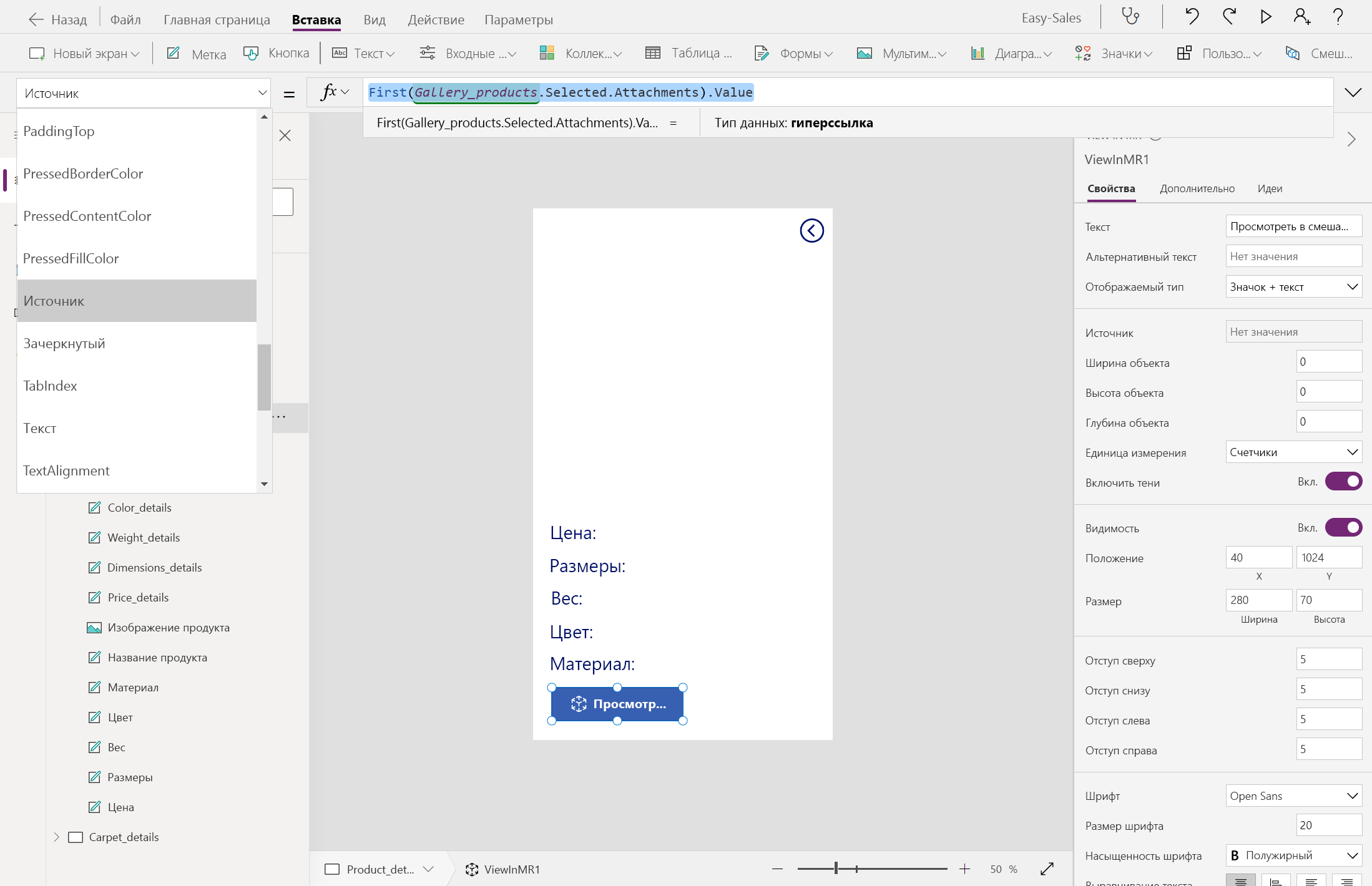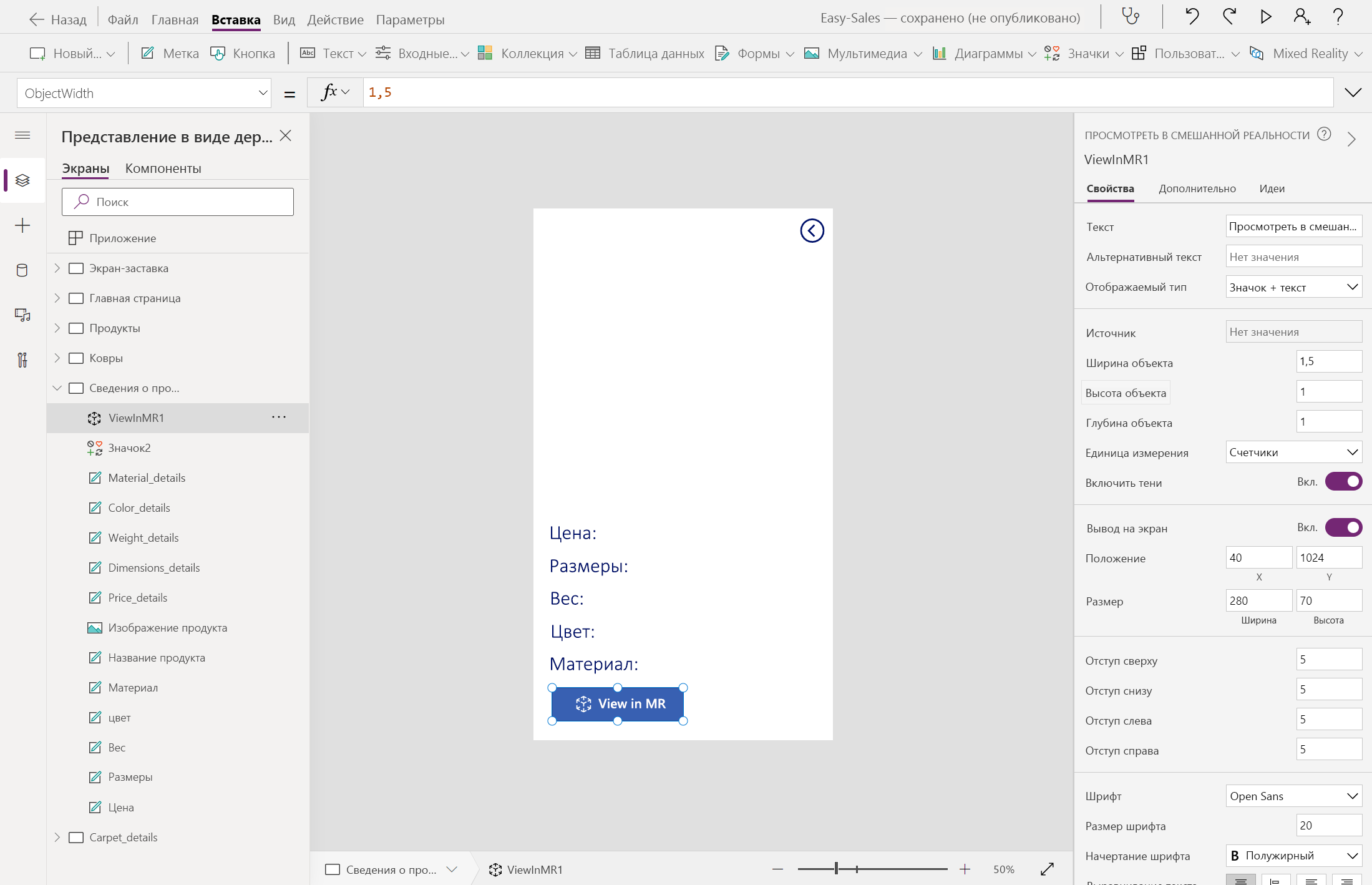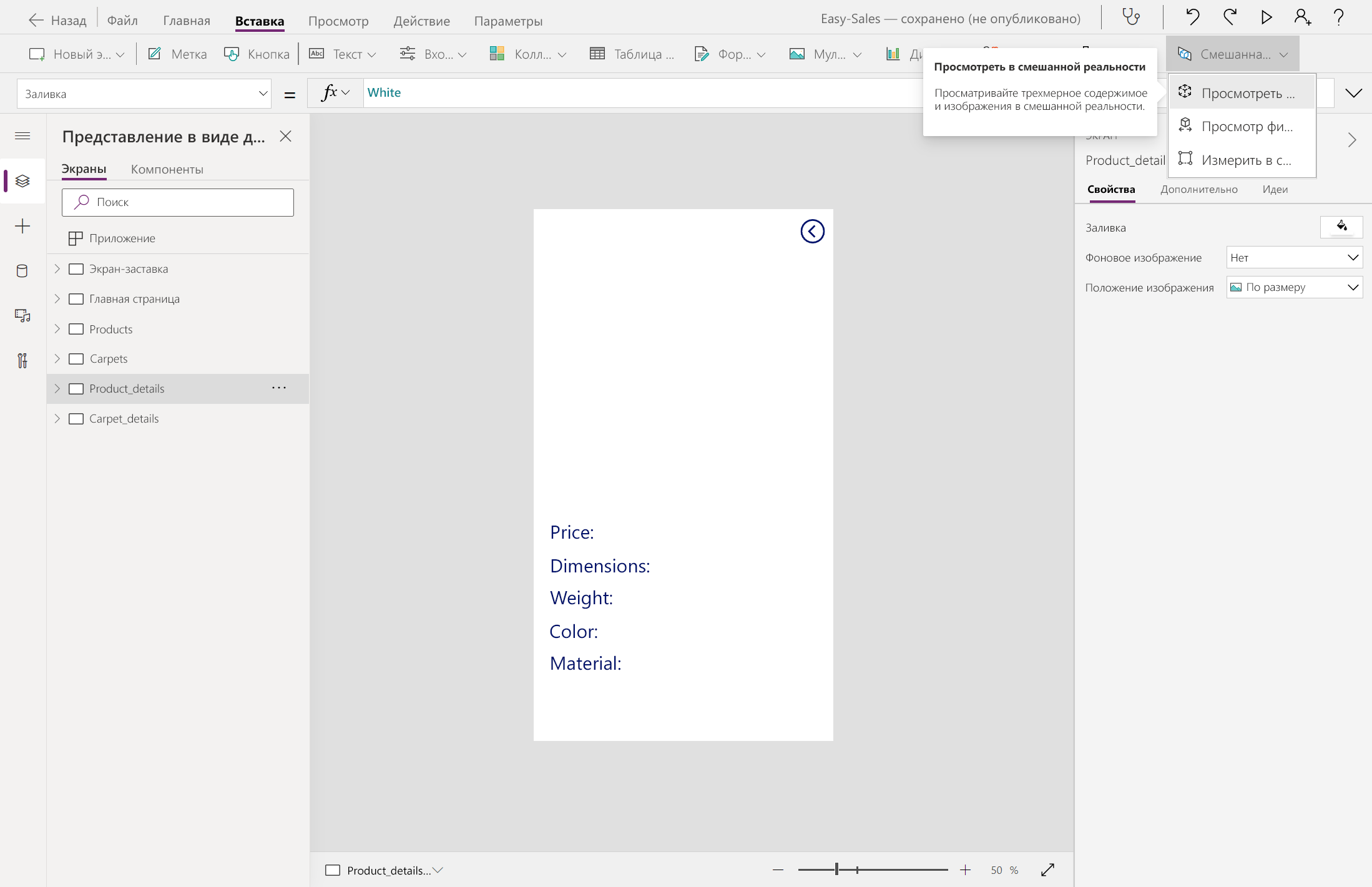 Добавьте компонент «Посмотреть в MR» на экран Product_details. Откройте вкладку Вставка, затем разверните раскрывающийся список Mixed Reality и выберите компонент Просмотр в MR.