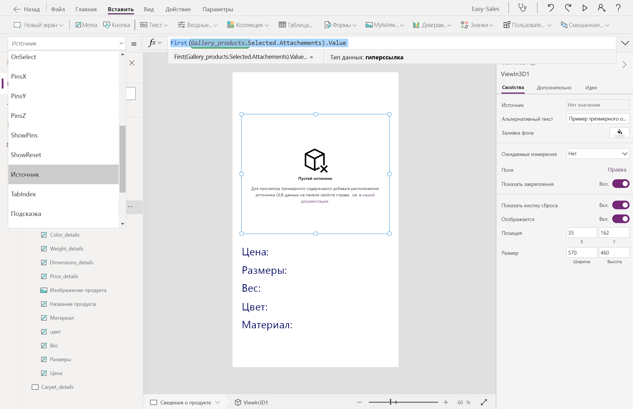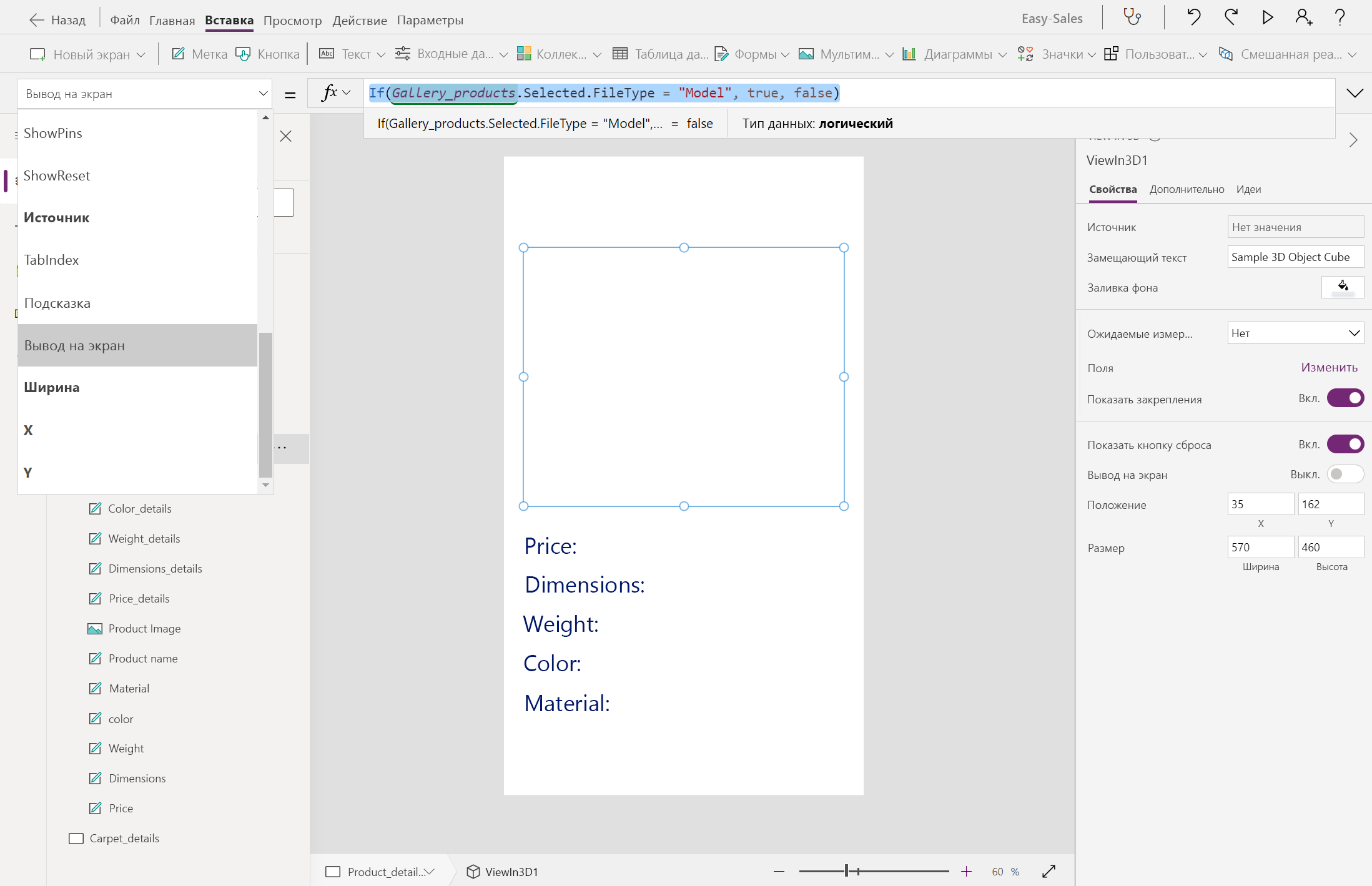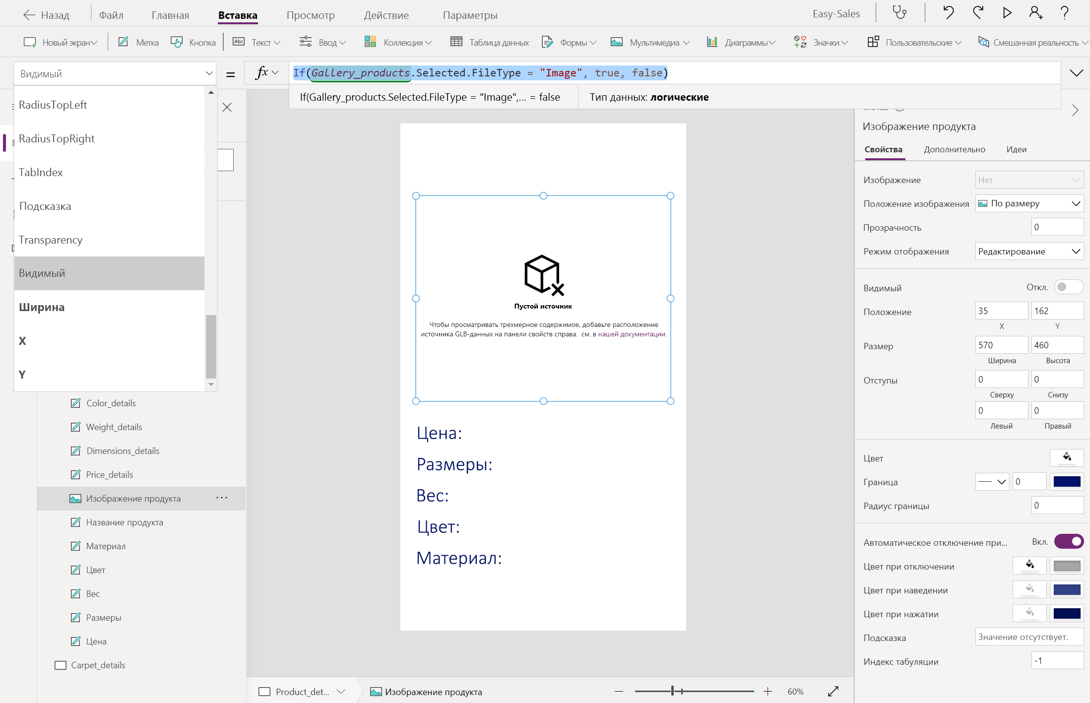 First(Gallery_products.Selected.Attachments).ValueМы изменим свойство Visible как изображения, так и представления в трехмерных компонентах, чтобы легко просматривать продукты в зависимости от типа файла, хранящегося в столбце "Вложения". Настройте свойство Visible компонентов Image и View in 3D следующим образом: