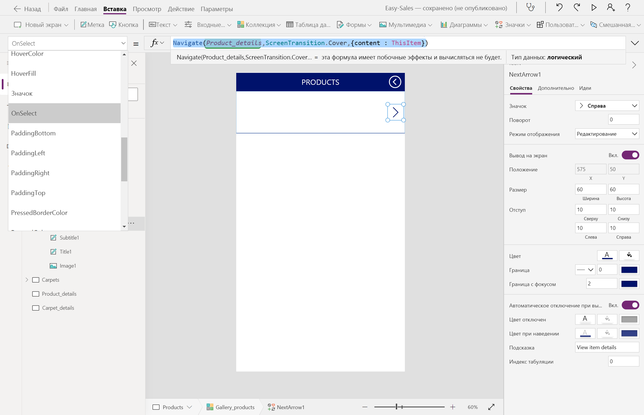 Выберите значок > в контроле галереи страницы «Продукты» и «Ковры». Затем настройте свойство OnSelect , добавив следующие строки на вкладке "Функции " соответственно.