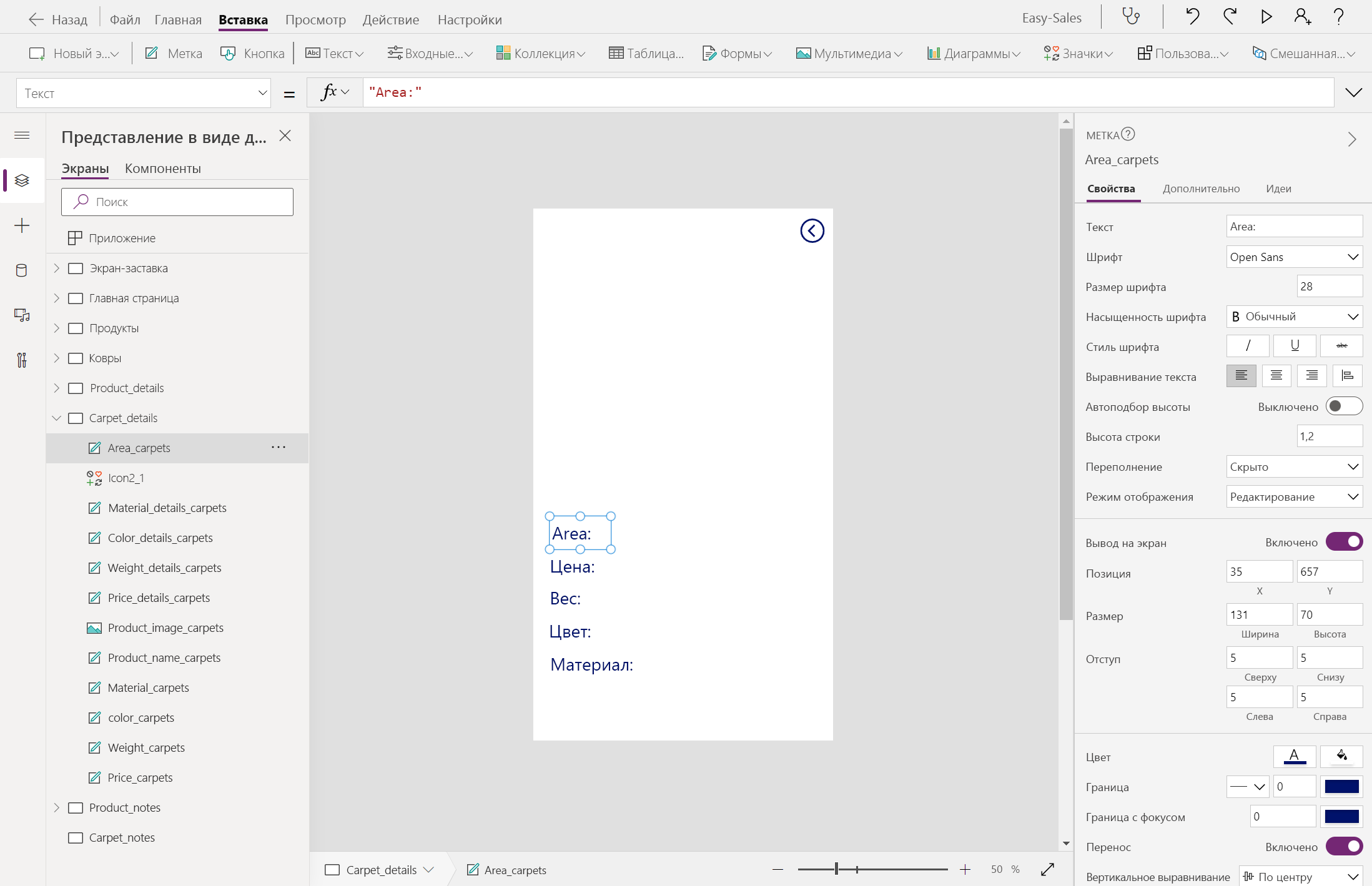 Перейдите на страницу Carpet_details, затем добавьте метку , а потом переименуйте её в Area_carpets.