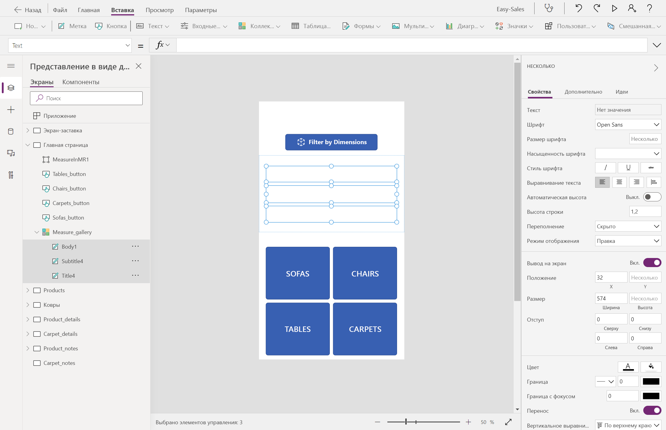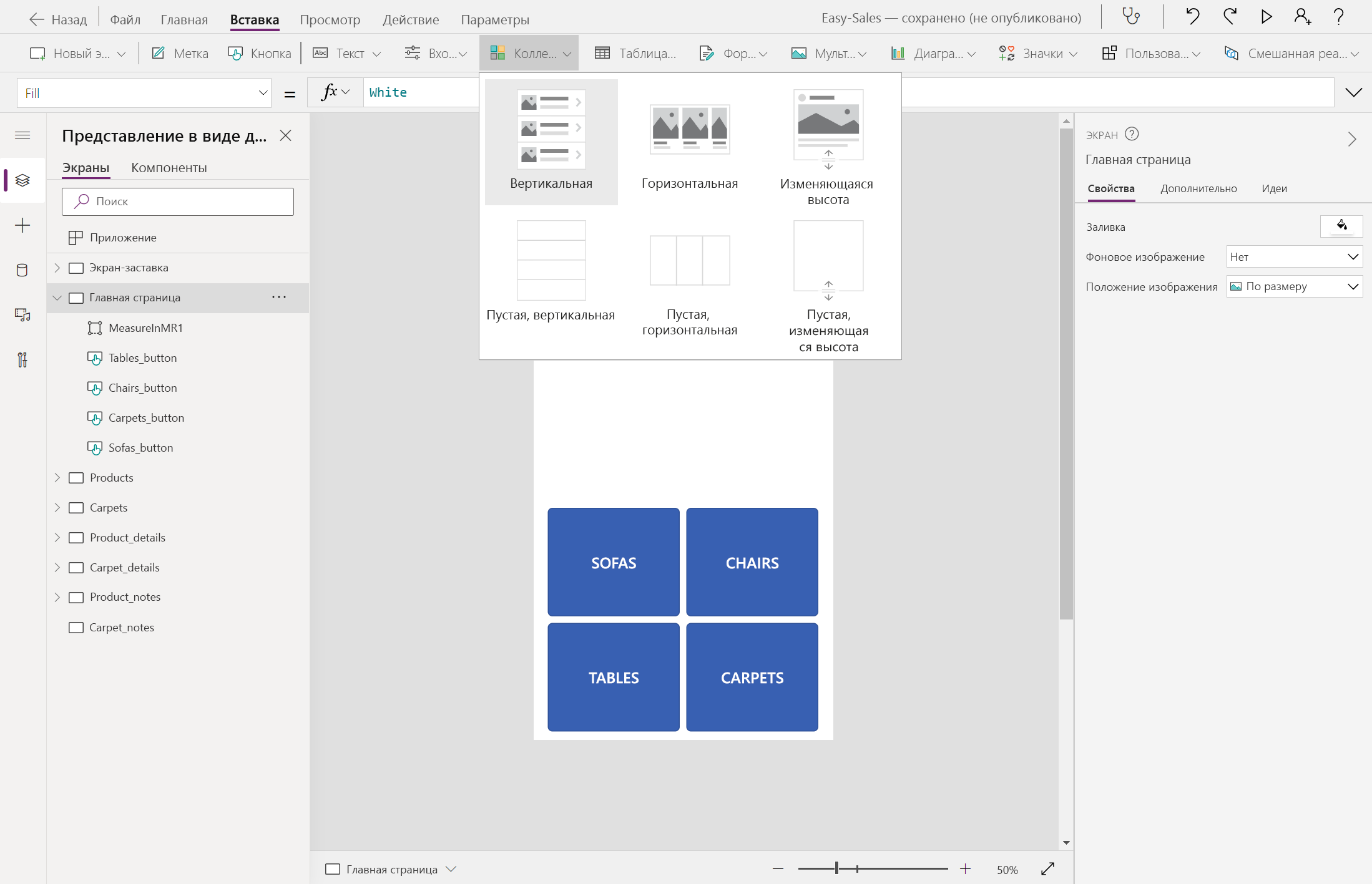 Перейдите на страницу Продукты, а затем настройте свойство Items для Gallery_products следующим образом: