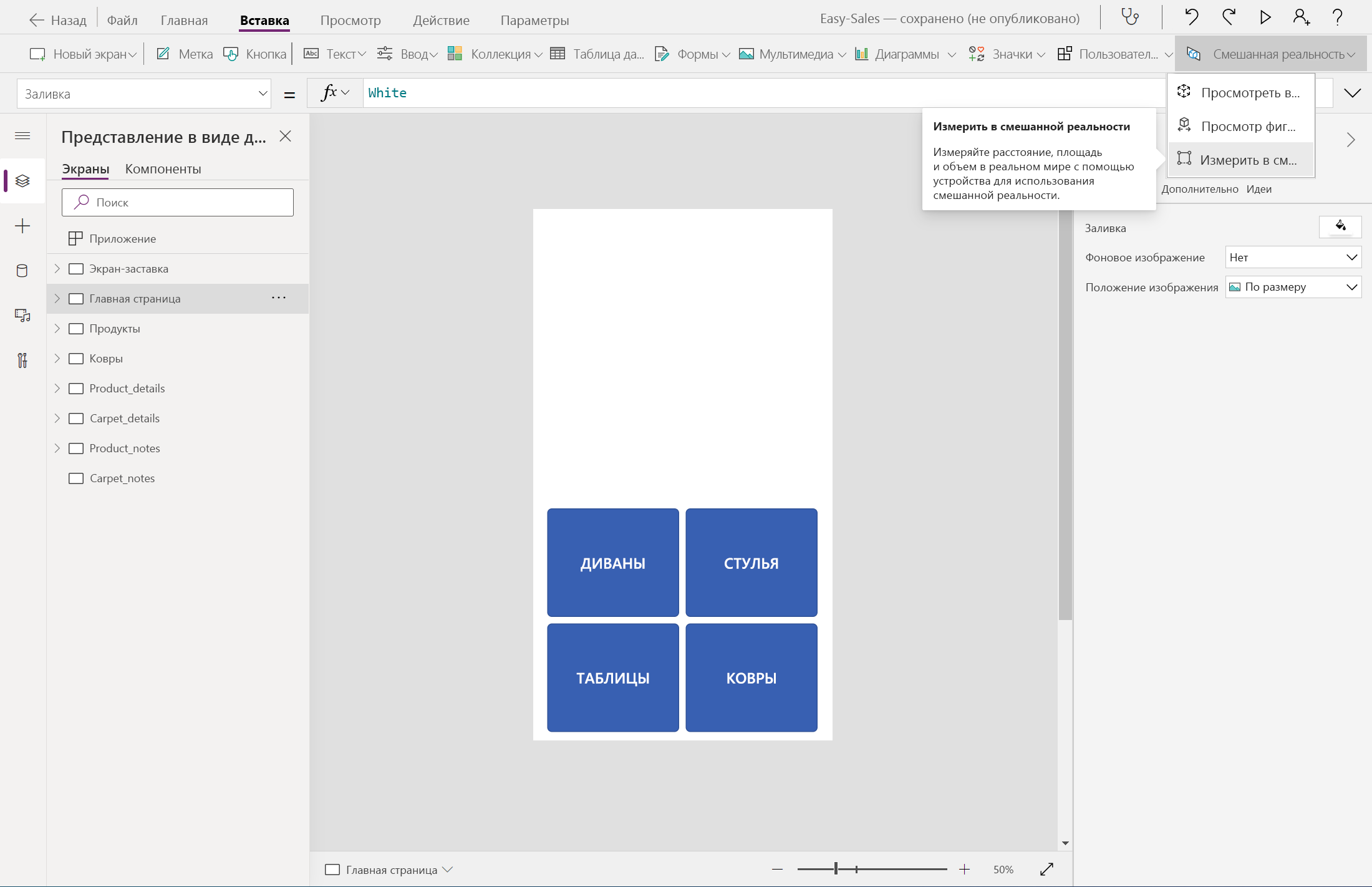 Перейдите на домашнюю страницу . На вкладке Вставка разверните раскрывающийся список смешанной реальности и выберите меру в MR.