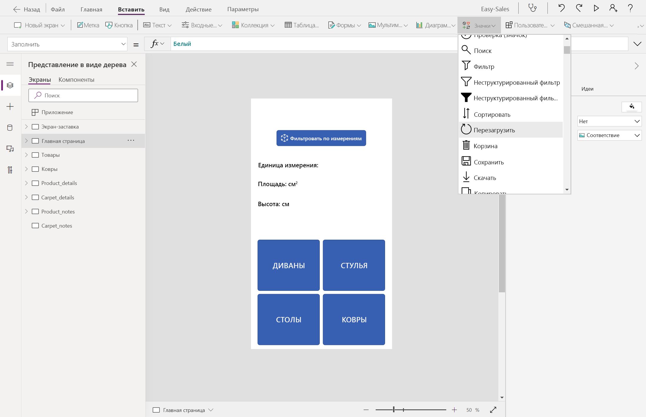 Давайте добавим значок для повторного проведения измерений, чтобы пользователи могли их повторить, если они не довольны. На вкладке Вставка разверните раскрывающийся список значков и щелкните значок перезагрузки.