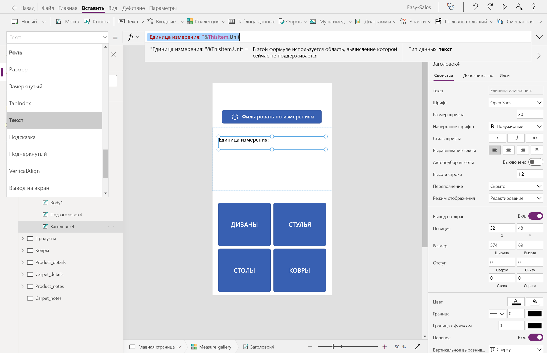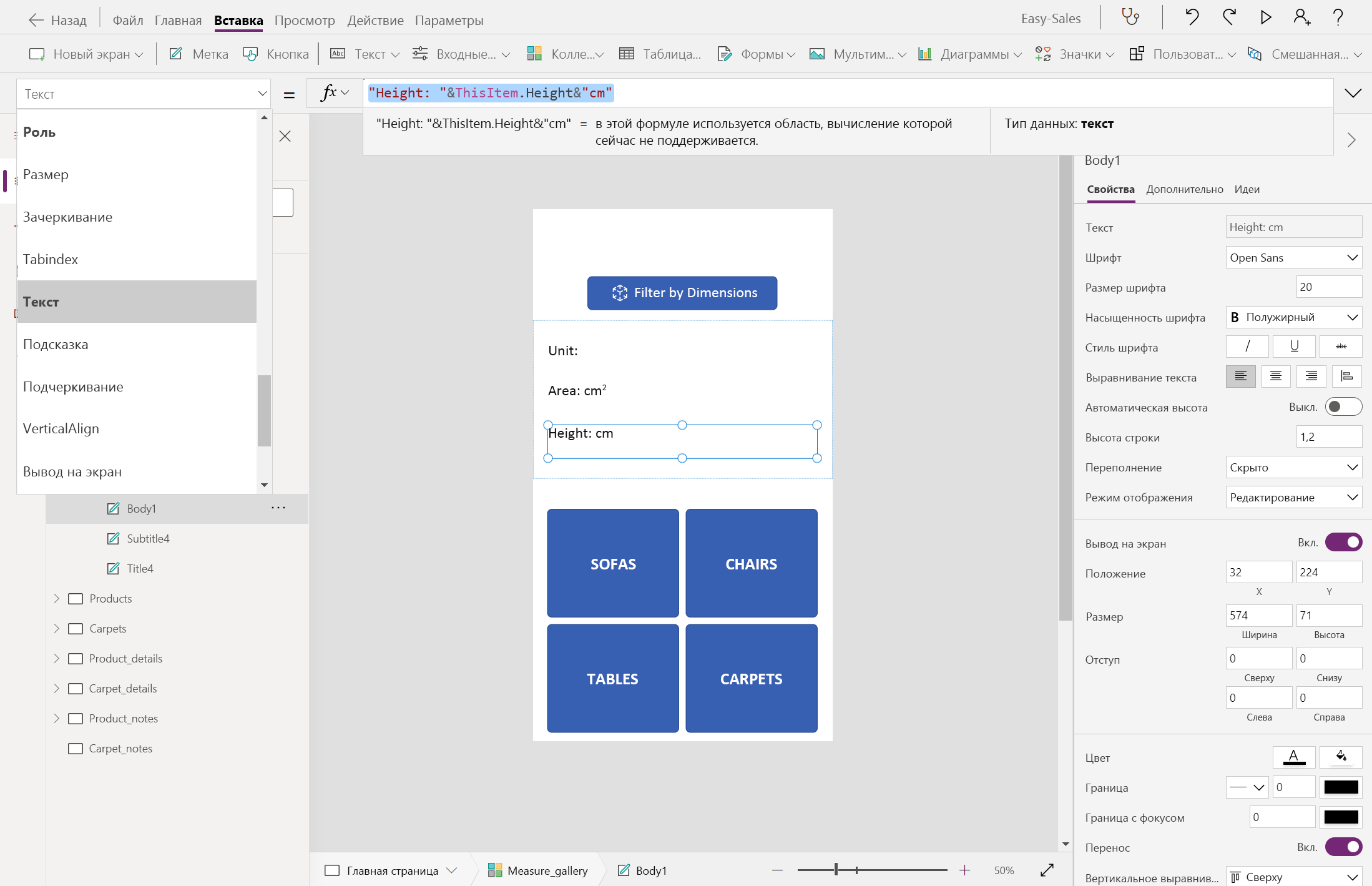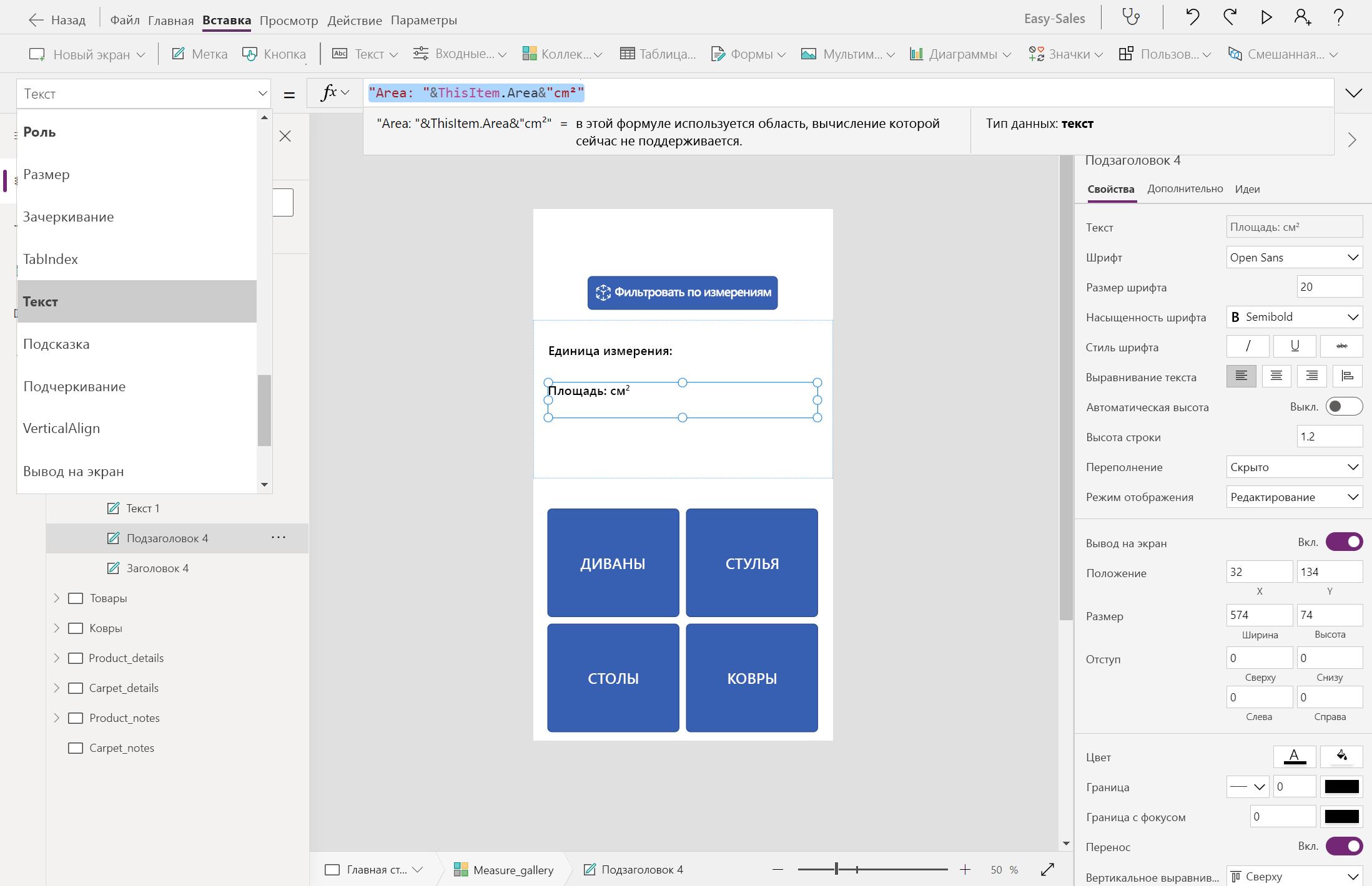 Measure_gallery.Selected.Area&"cm²"Настройте метку рядом с меткой Price следующим образом, чтобы отобразить вычисляемую цену: