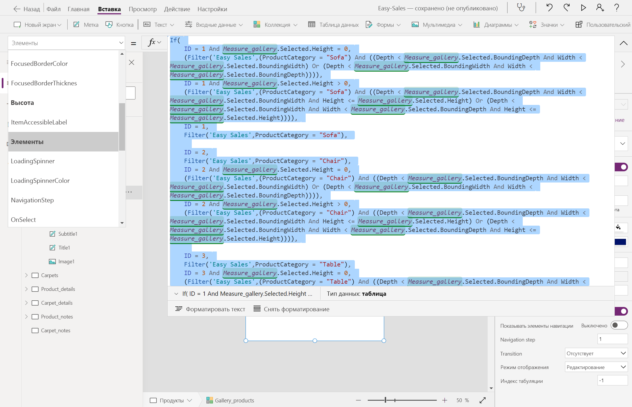 If( ID = 1 And Measure_gallery.Selected.Height = 0, (Filter('Easy Sales',(ProductCategory = "Sofa") And ((Depth < Measure_gallery.Selected.BoundingDepth And Width < Measure_gallery.Selected.BoundingWidth) Or (Depth < Measure_gallery.Selected.BoundingWidth And Width < Measure_gallery.Selected.BoundingDepth)))), ID = 1 And Measure_gallery.Selected.Height > 0, (Filter('Easy Sales',(ProductCategory = "Sofa") And ((Depth < Measure_gallery.Selected.BoundingDepth And Width < Measure_gallery.Selected.BoundingWidth And Height <= Measure_gallery.Selected.Height) Or (Depth < Measure_gallery.Selected.BoundingWidth And Width < Measure_gallery.Selected.BoundingDepth And Height <= Measure_gallery.Selected.Height)))), ID = 1, Filter('Easy Sales',ProductCategory = "Sofa"), ID = 2, Filter('Easy Sales',ProductCategory = "Chair"), ID = 2 And Measure_gallery.Selected.Height = 0, (Filter('Easy Sales',(ProductCategory = "Chair") And ((Depth < Measure_gallery.Selected.BoundingDepth And Width < Measure_gallery.Selected.BoundingWidth) Or (Depth < Measure_gallery.Selected.BoundingWidth And Width < Measure_gallery.Selected.BoundingDepth)))), ID = 2 And Measure_gallery.Selected.Height > 0, (Filter('Easy Sales',(ProductCategory = "Chair") And ((Depth < Measure_gallery.Selected.BoundingDepth And Width < Measure_gallery.Selected.BoundingWidth And Height <= Measure_gallery.Selected.Height) Or (Depth < Measure_gallery.Selected.BoundingWidth And Width < Measure_gallery.Selected.BoundingDepth And Height <= Measure_gallery.Selected.Height)))), ID = 3, Filter('Easy Sales',ProductCategory = "Table"), ID = 3 And Measure_gallery.Selected.Height = 0, (Filter('Easy Sales',(ProductCategory = "Table") And ((Depth < Measure_gallery.Selected.BoundingDepth And Width < Measure_gallery.Selected.BoundingWidth) Or (Depth < Measure_gallery.Selected.BoundingWidth And Width < Measure_gallery.Selected.BoundingDepth)))), ID = 3 And Measure_gallery.Selected.Height > 0, (Filter('Easy Sales',(ProductCategory = "Table") And ((Depth < Measure_gallery.Selected.BoundingDepth And Width < Measure_gallery.Selected.BoundingWidth And Height <= Measure_gallery.Selected.Height) Or (Depth < Measure_gallery.Selected.BoundingWidth And Width < Measure_gallery.Selected.BoundingDepth And Height <= Measure_gallery.Selected.Height)))) )Важный