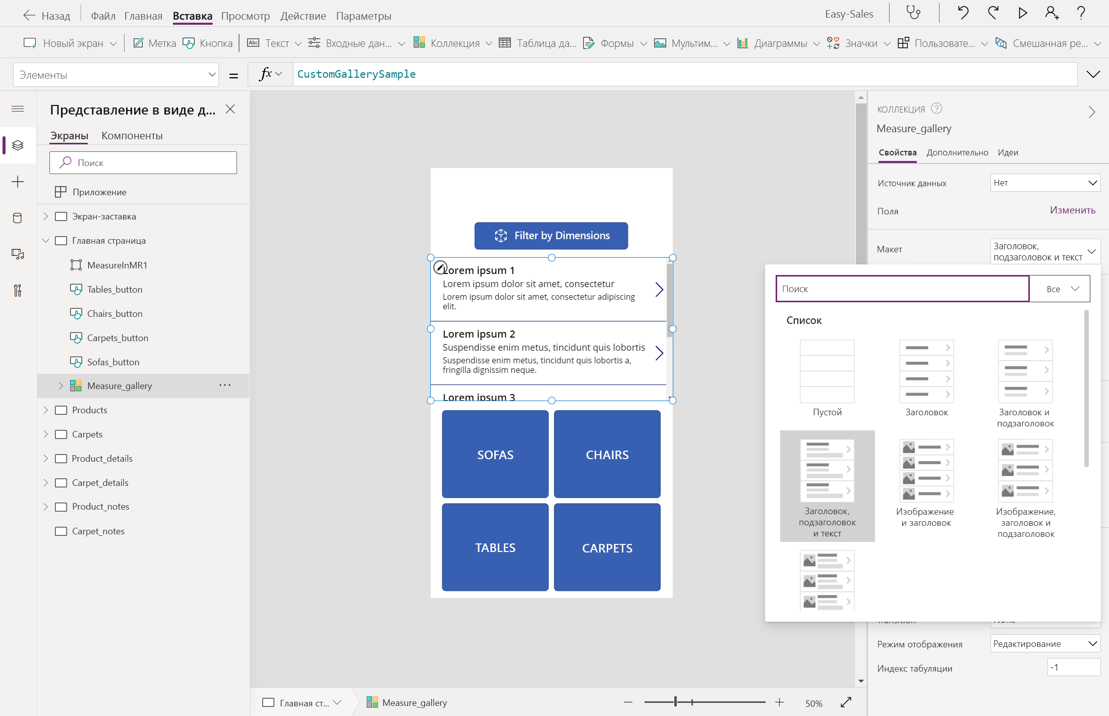Поместите вертикальную галерею чуть ниже кнопки "Фильтр по измерениям". Настройте свойство макета, выбрав заголовок, подзаголовок и текст.