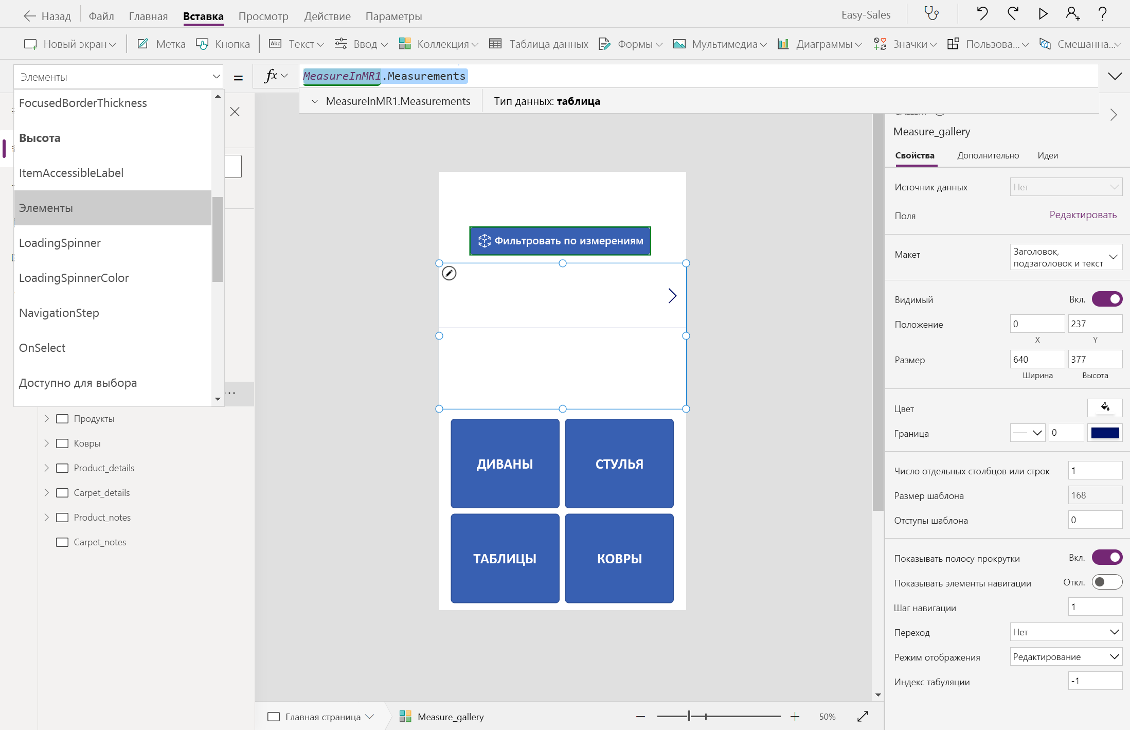 Настройте свойство Items элемента Measure_gallery, добавив следующую строку: