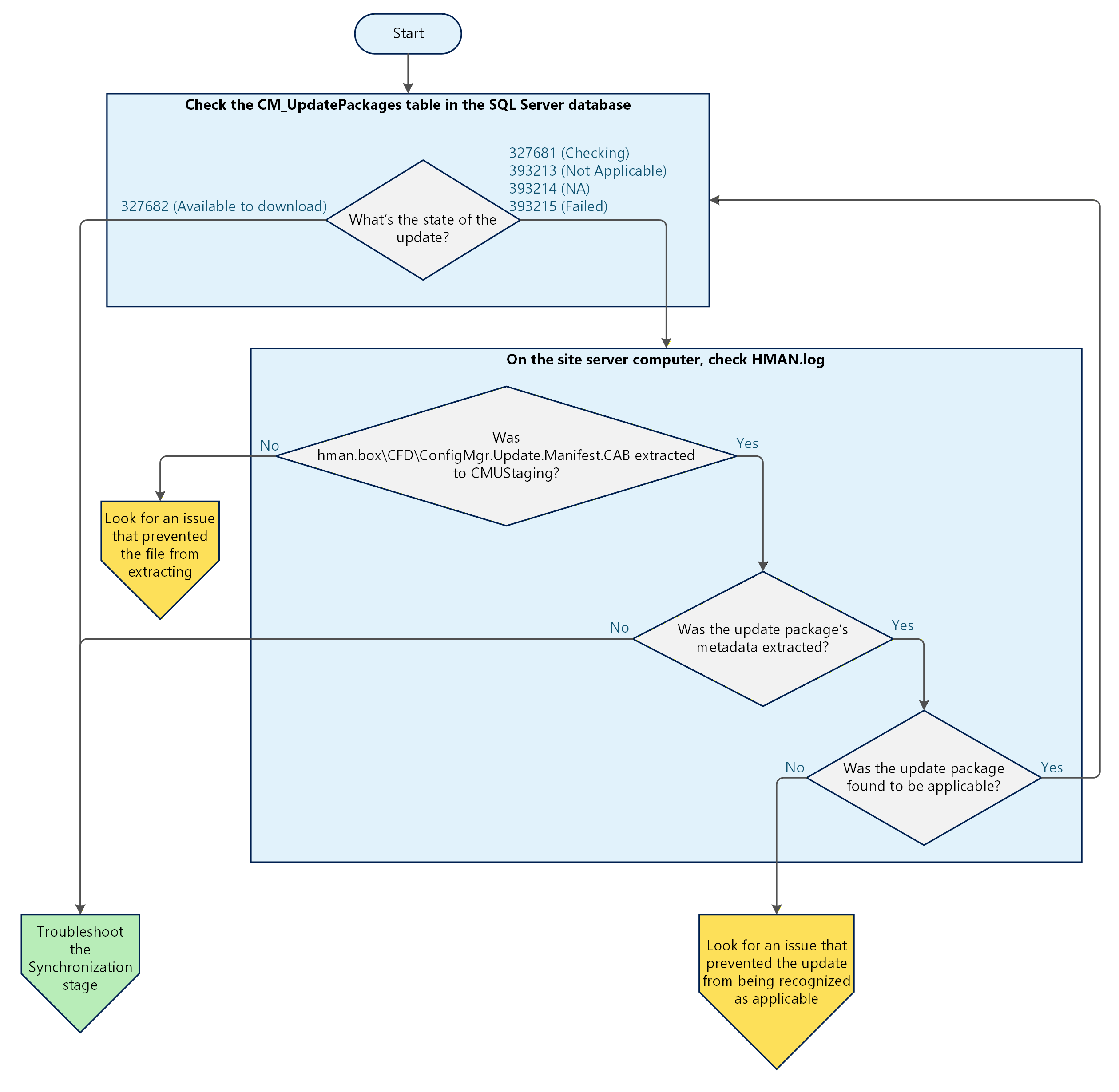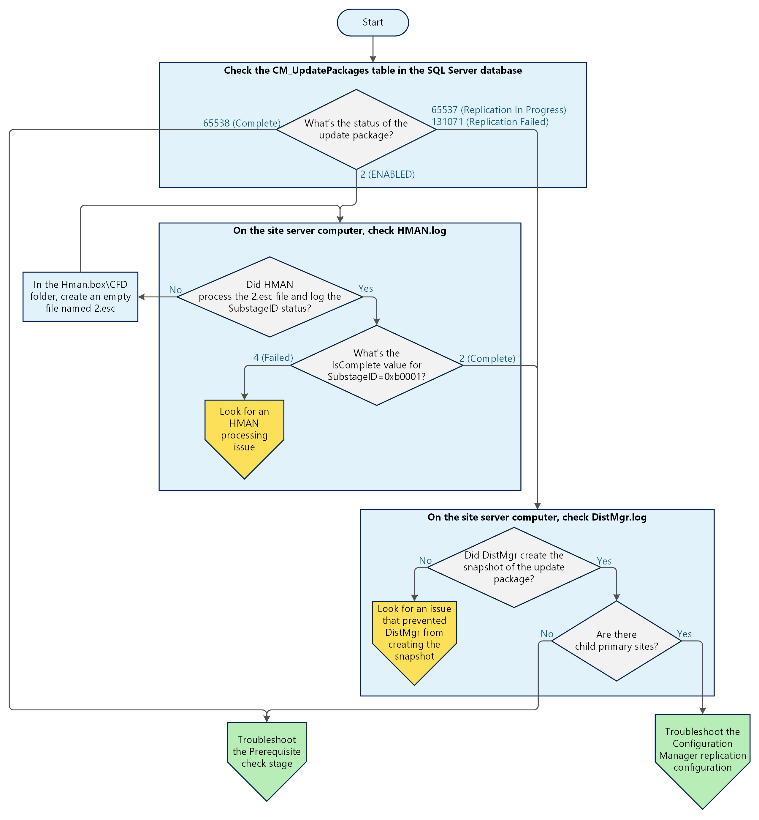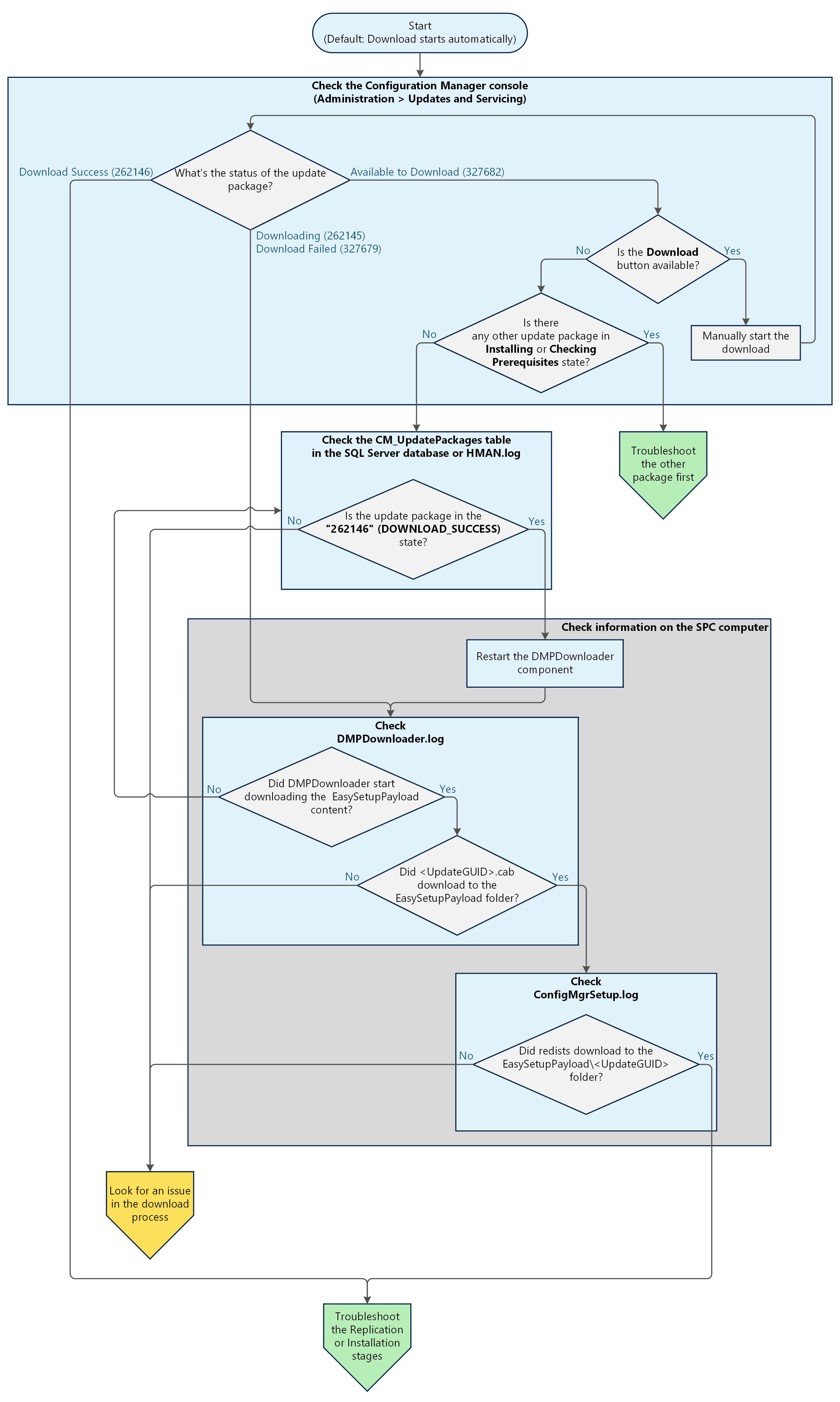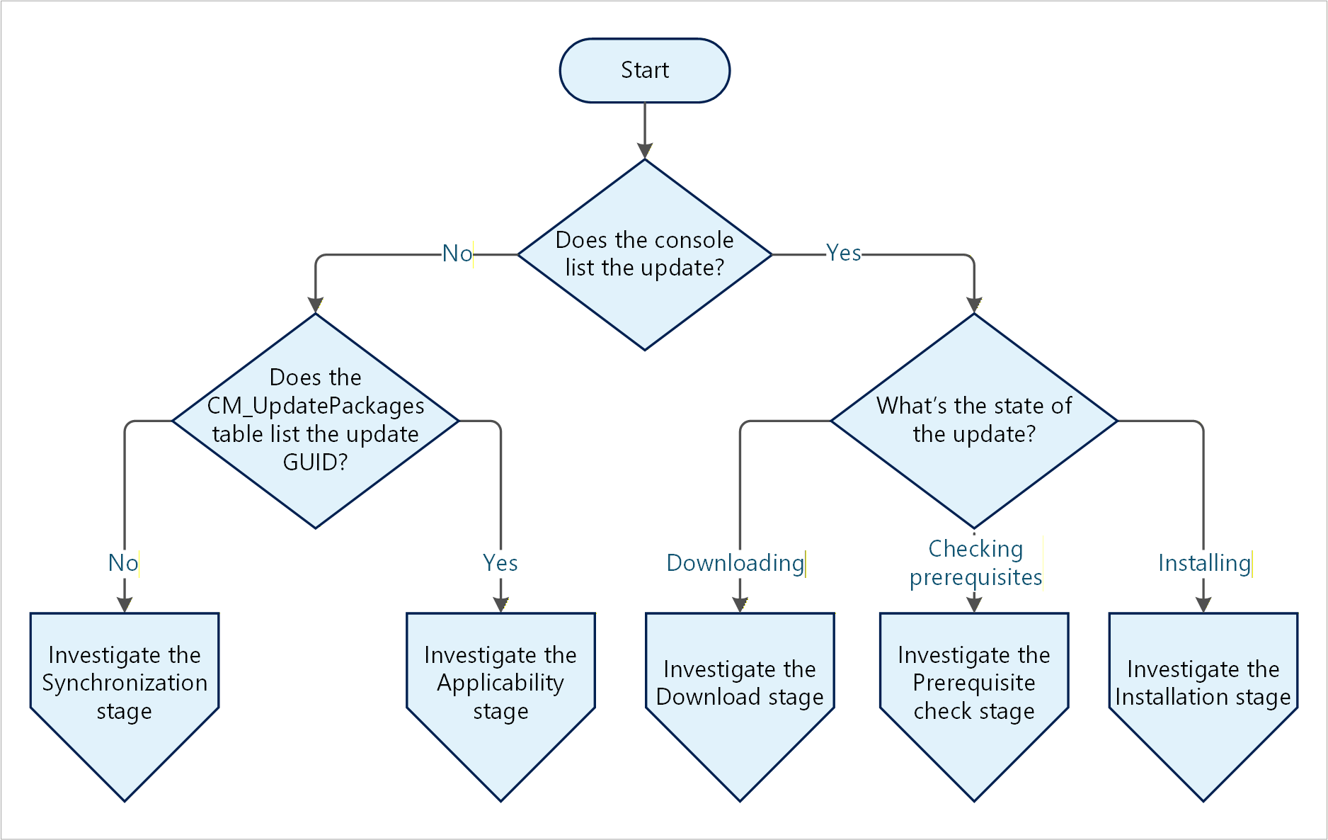 Знание этапа, на котором обновление завершилось сбоем, дает отправную точку для устранения проблемы. Используйте следующую схему, чтобы определить этап установки пакета обновления.