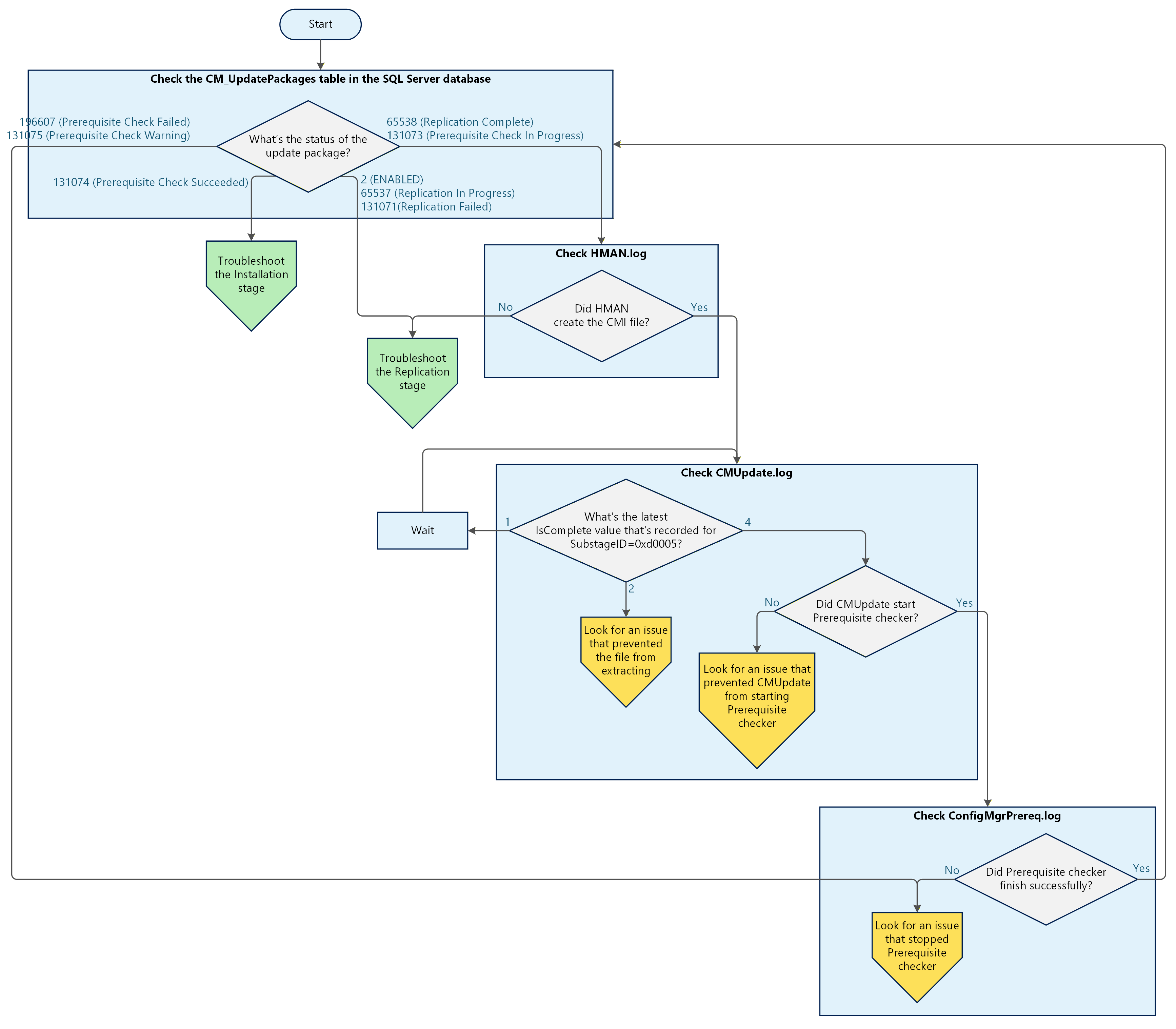 Сбои могут возникать на любом этапе установки. CMUpdate.log — это основной журнал, используемый для изучения проблем с установкой. Однако если сбой возникает при выполнении любого из этапов после установки, просмотрите файл SiteComp.log сведения о переустановке компонентов и файле SMSExec.log для получения сведений о запуске компонента.