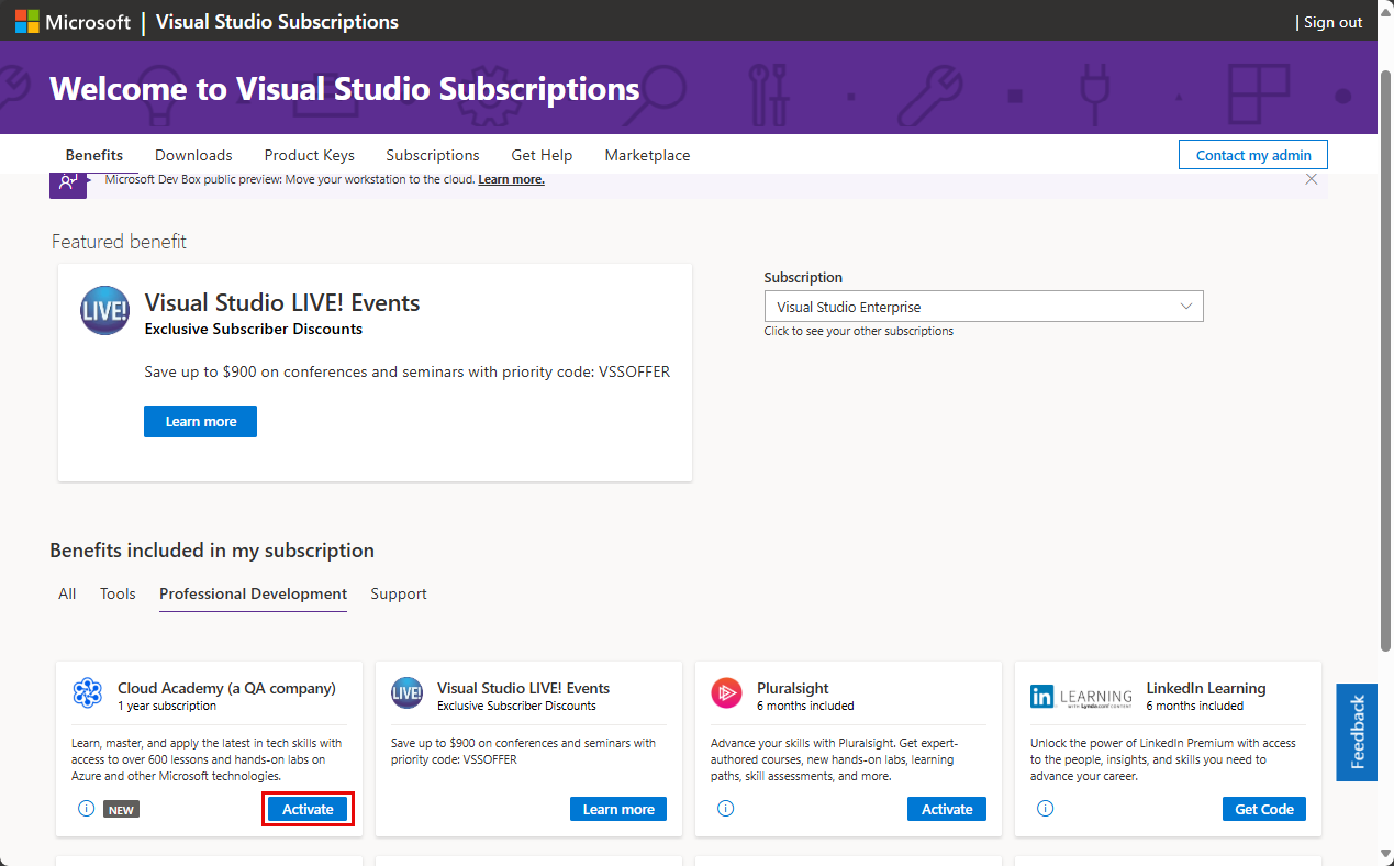 Чтобы активировать преимущество Cloud Academy с подпиской Visual Studio, перейдите на страницу подписки Visual Studio и выберите вкладку Преимущества. В разделе Преимущества, включенные в мою подписку, на плитке Cloud Academy выберите Активировать.