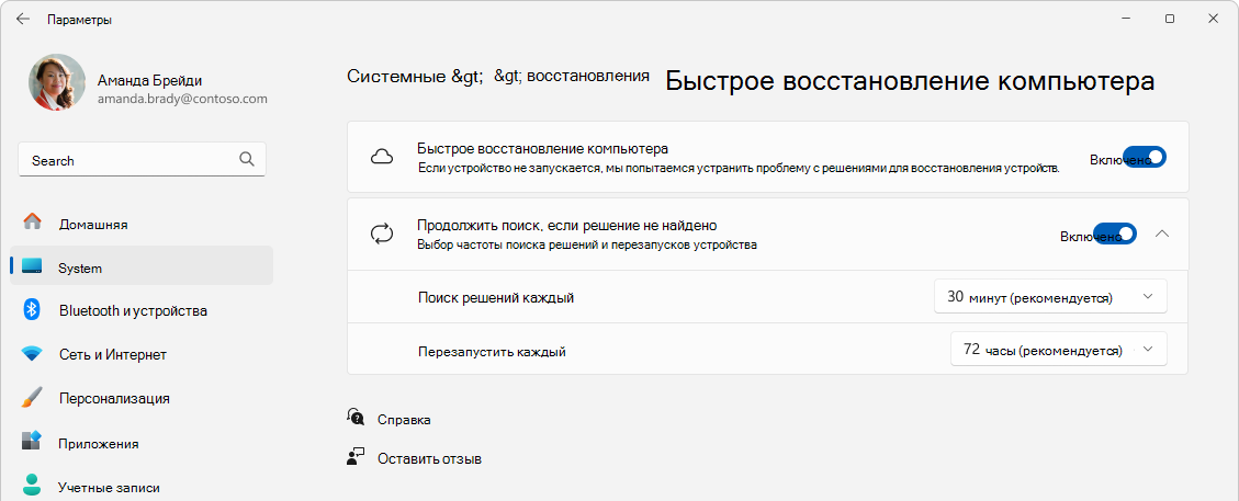 Чтобы предоставить отзыв о быстром восстановлении компьютера, откройте Центр отзывов и используйте категорию Восстановление и удаление>быстрого восстановления компьютера.