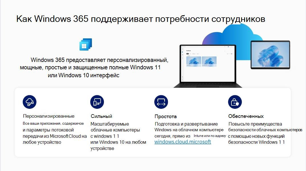Windows 365 — это упрощенное решение SaaS (программное обеспечение как услуга), которое не требует специализированных ИТ-навыков помимо тех, которые используются для подготовки физических компьютеров и управления ими, поскольку корпорация Майкрософт управляет инфраструктурой. Windows 365 предоставляет облачные компьютеры — полный и защищенный интерфейс Windows, размещенный в Microsoft Cloud и доступный на любом устройстве.