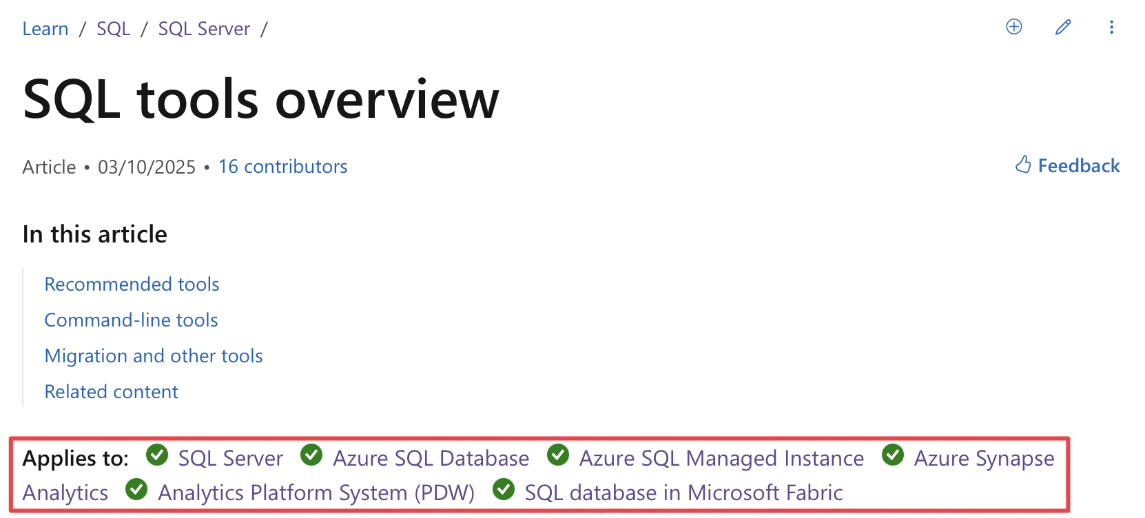 Each SQL Server article contains an applies-to include file after the title. This indicates what areas or versions of SQL Server the article applies to.