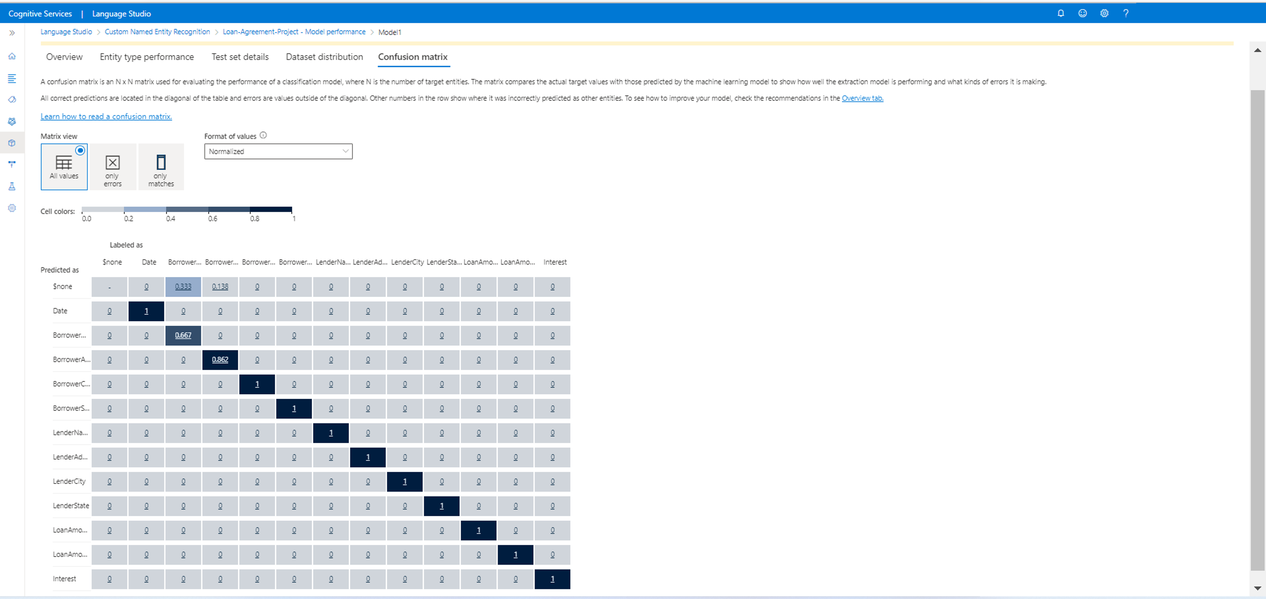 Unclear distinction between entity types in training set: When the training data is similar for multiple entity types, it can lead to lower accuracy because the entity types may be frequently misclassified as each other. Review the following entity types and consider merging them if they're similar. Otherwise, add more examples to better distinguish them from each other. You can check the confusion matrix tab for more guidance.