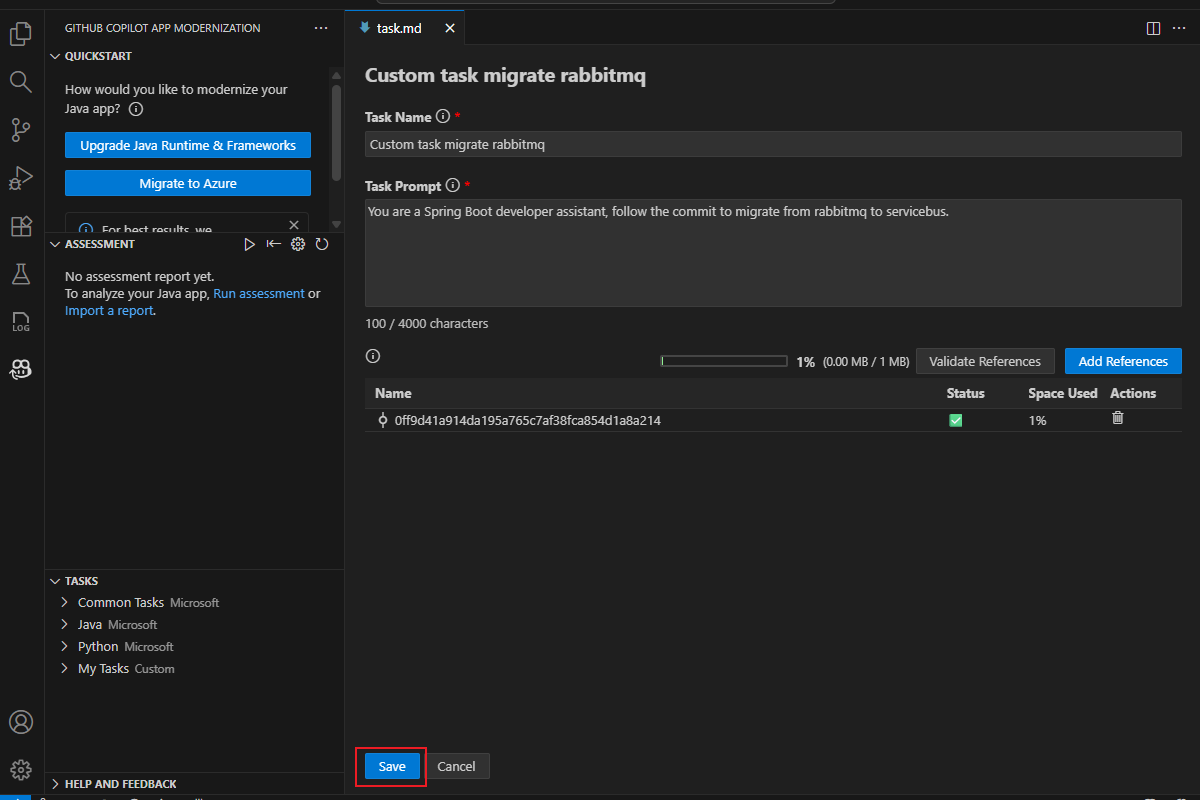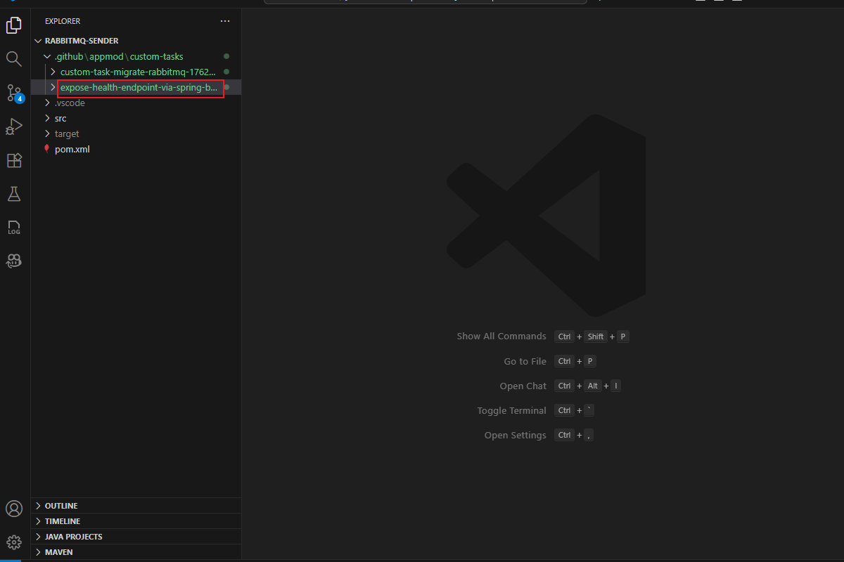 rabbitmq-senderproject folder from the cloned repository. Then, switch to the source branch.In the Activity sidebar, open the GitHub Copilot app modernization extension pane, hover over the TASKS section, and then select Create a Custom Task.