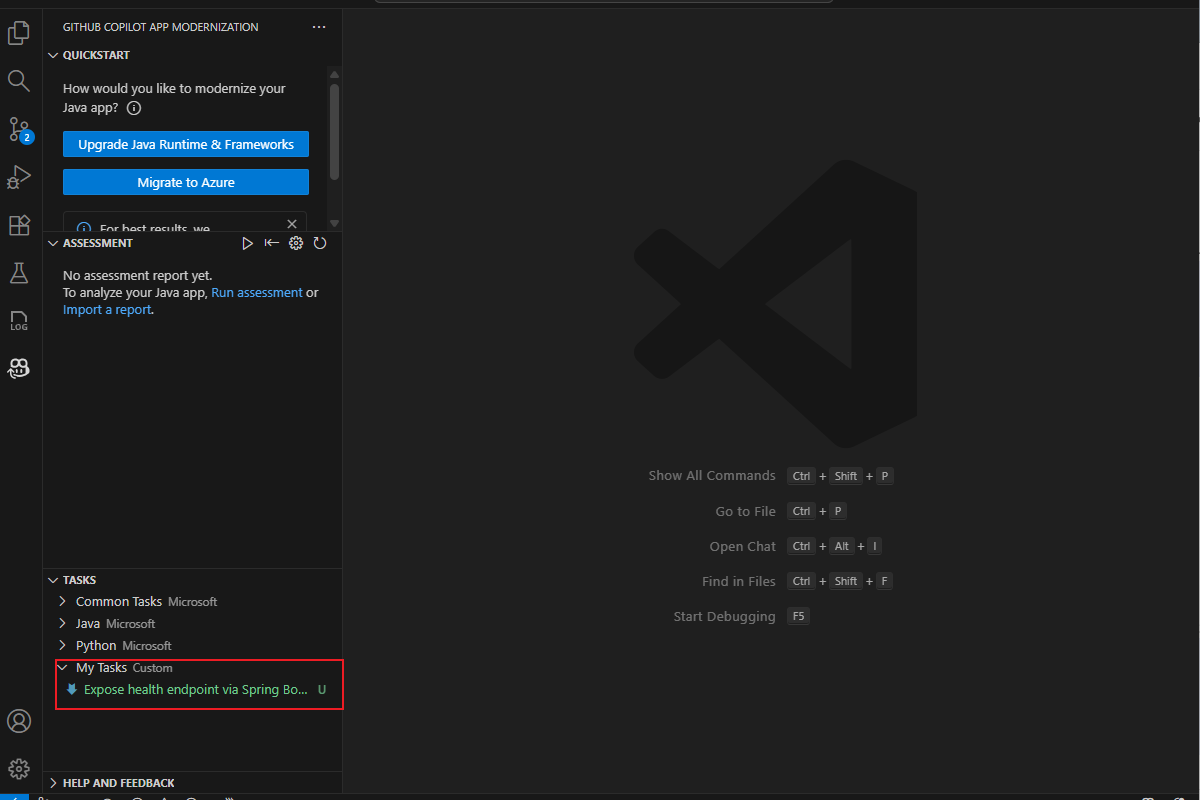 This quickstart shows you how to create and apply your own tasks when you use GitHub Copilot app modernization.